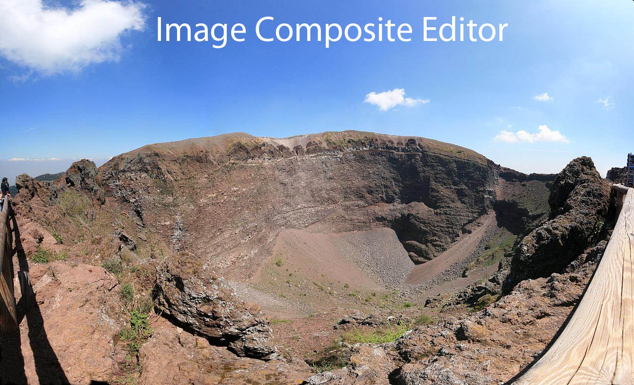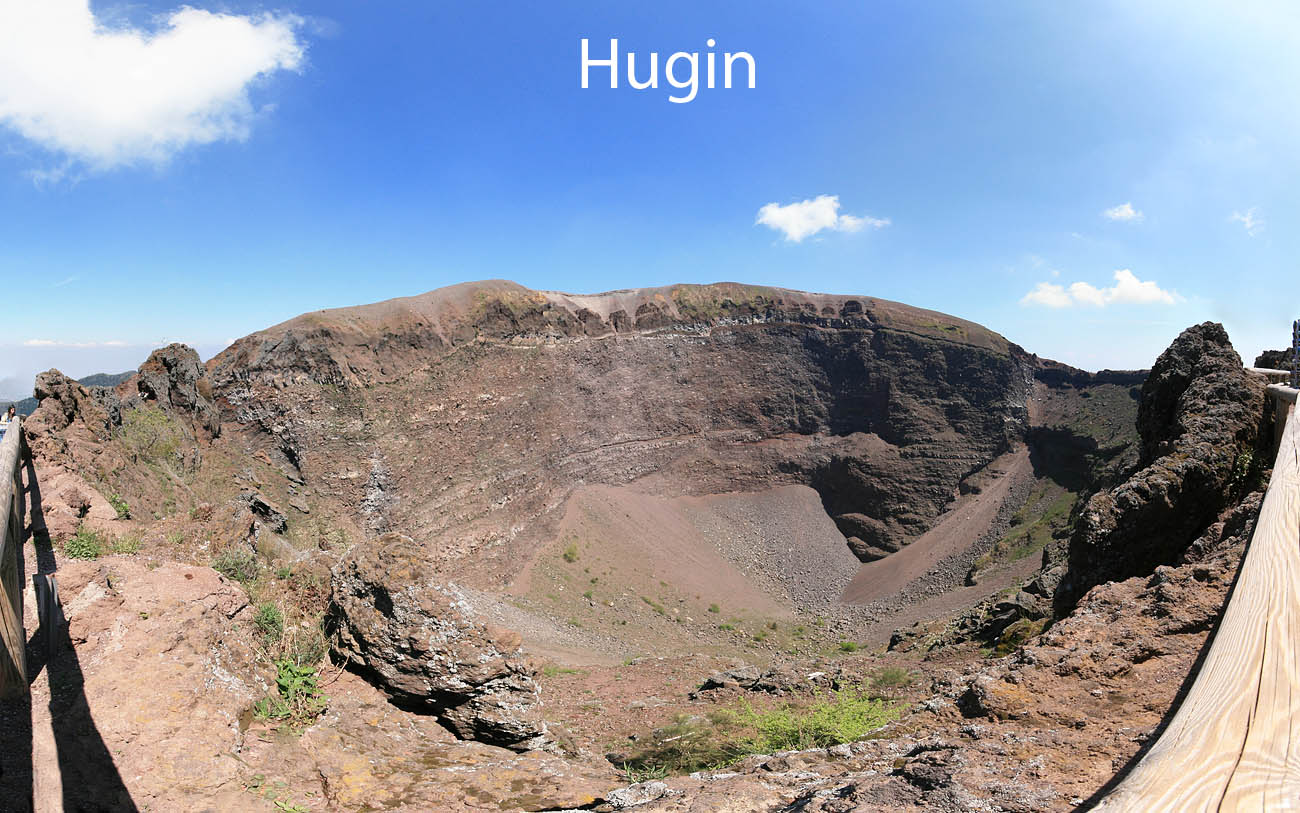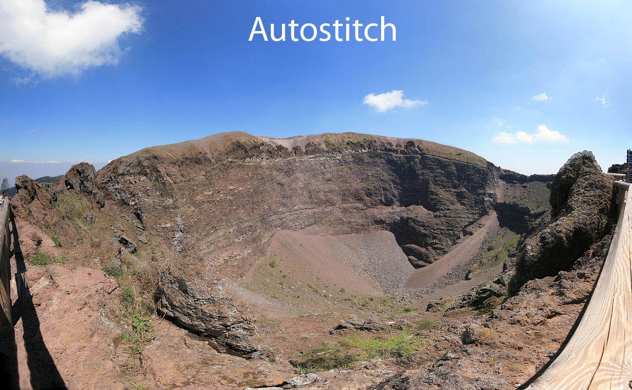 Der Krater des Vesuv in Neapel hat einen Durchmesser von ca. 650 m und eine Tiefe von etwa 250 m. Vom Kraterrand aus war auch mit dem 100° Weitwinkeobjektiv keine Gesamtaufnahme möglich. Deshalb der Versuch eines Panoramas aus 3X3 Bildern. Der Bildwinkel beträgt ca. 180 x 120° Canon EOS 400 D, Sigma 10-20 mm, Automatik, ohne Stativ. Die Kamera wurde anähernd um den vorderen Nodalpunkt des Objektivs geschwenkt und gekippt.