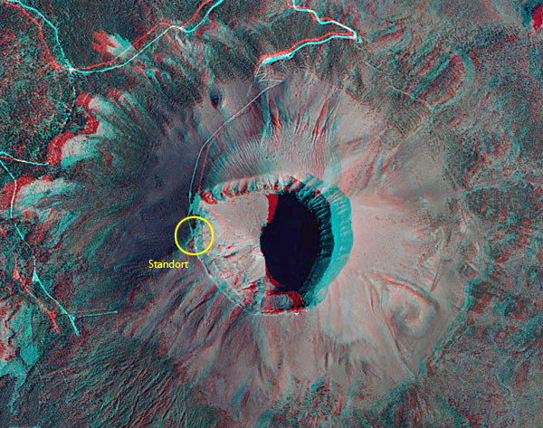 Zur Veranschaulichung der Aufnahmesituation hier ein 3D Bild des Vulkans, mit dem 3D StereoPhotoMaker aus zwei Screenshots aus "bing" erstellt. Bitte mit Rot-Cyan Brille betrachten.