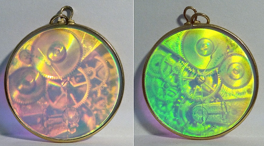 Es geht um ein Hologramm in Form einer Taschenuhr (rund mit Anhänge-Öse), welches die beiden Seiten einer solchen Uhr zeigt. Siehe das folgende Foto: