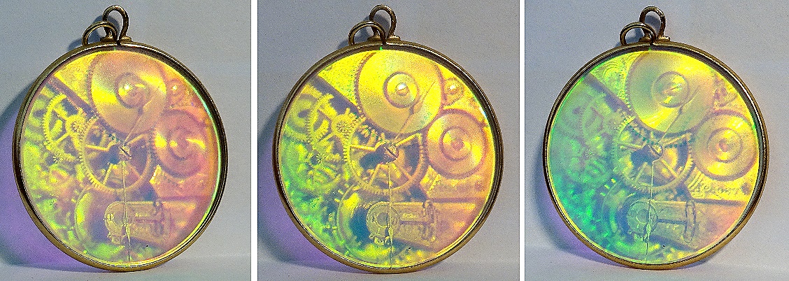 Hier jetzt der Versuch ein wenig die eine Seite des Hologramms zu zeigen in dem drei Betrachtungswinkel (links, Mitte, rechts) zu sehen sind. Bei genauem Hinsehen kann man durchaus die Wirkung betrachten, vielleicht auch die Mittelachse der Zeiger in den Fokus nehmen.