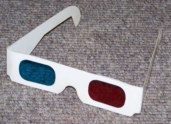 Hier eine meiner Anaglyphenbrillen mit Plastik-Scheiben, die ich auch über die Normalbrille bekomme:
