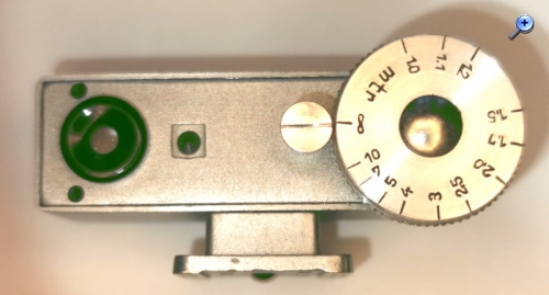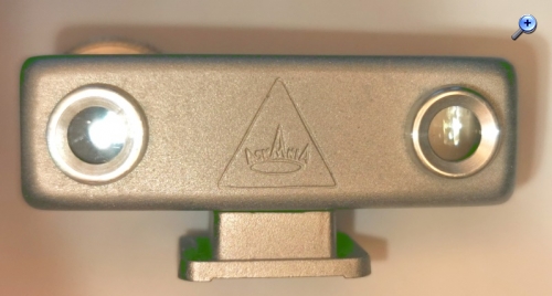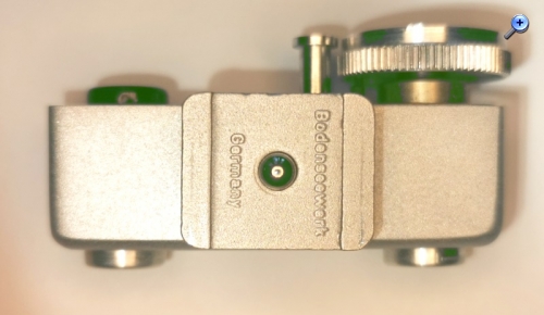 Der Aufsteckentfernungsmesser von der mir bisher unbekannten Firma "Bodenseewerk" (Germany) hat eine Messbasis von 3,5 cm. Die Entfernungserkennung reicht von 1,0 Meter bis unendlich. Das Gerätchen wird auf den Blitzadapter des Photoapparates gesteckt.