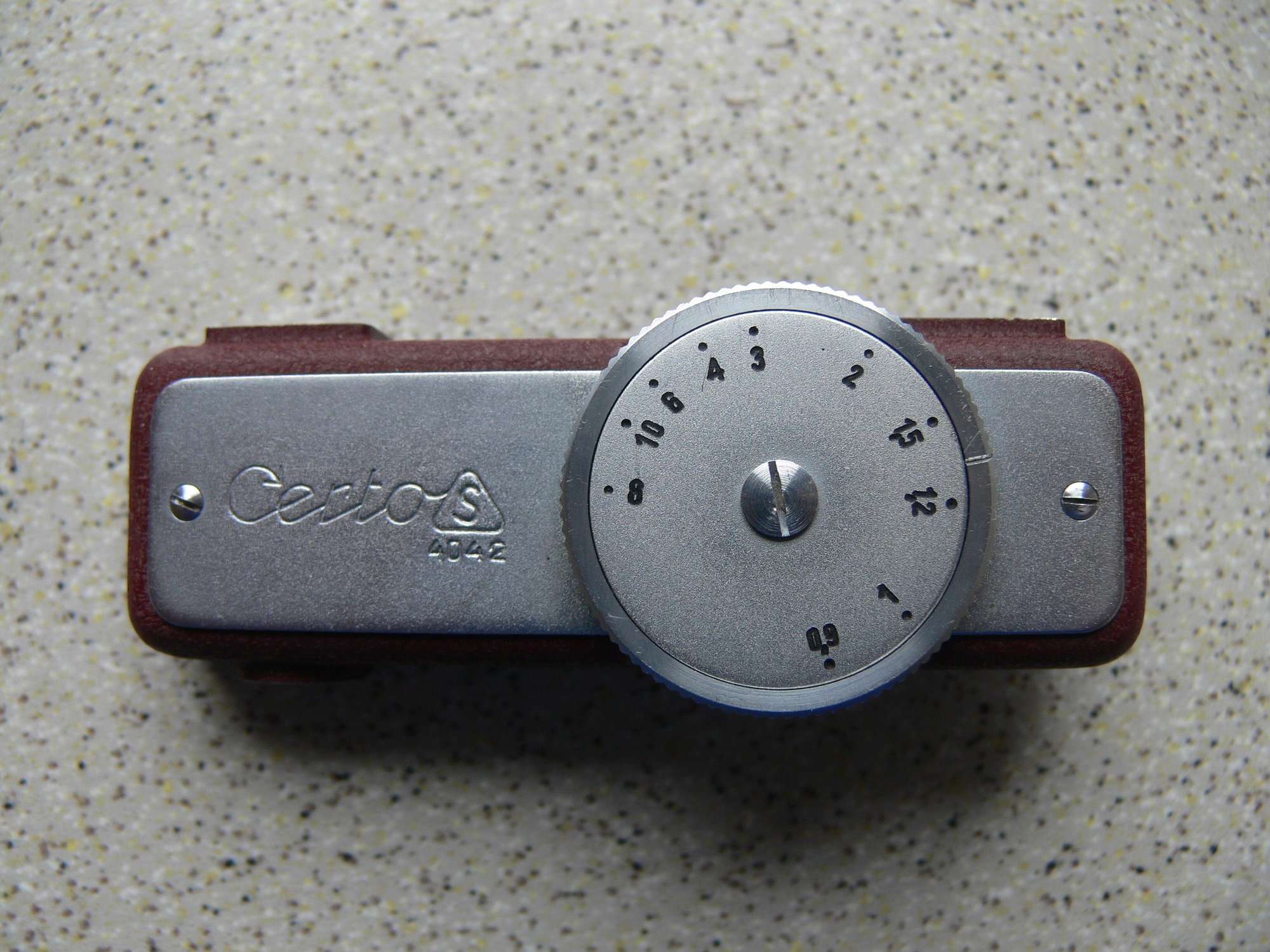 der Entfernungsmesser wurde ab 1951 gebaut es gab ihn in Unterschiedlichen Ausführungen die sich aber nur im Schuh waren, erhöhter Schuh für Altissa, mittiger Schuh, seitlicher Schuh. Das Material: aus dem vollen gefräst und die Lakierung in rotbraun ist ein ganz feiner (Mikro) genarbter Lack