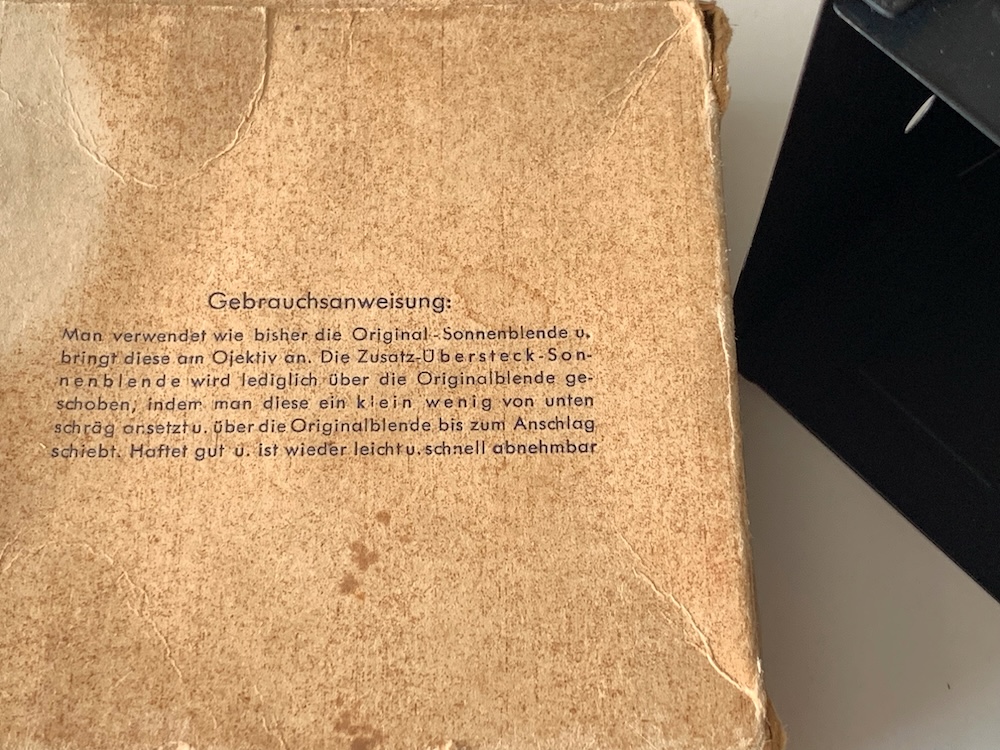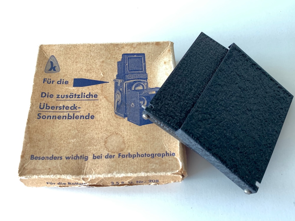 heute möchte ich ein etwas kurioses Zubehörteil zeigen. Zu allen Rolleiflex-Modellen gab es bekanntlich passende Streulichtblenden. Einem unbekannten Hersteller reichte deren Wirkung aber offenbar nicht aus; er bot eine „Übersteck-Sonnenblende“ an.