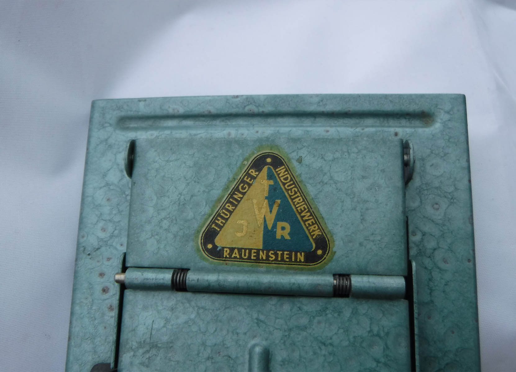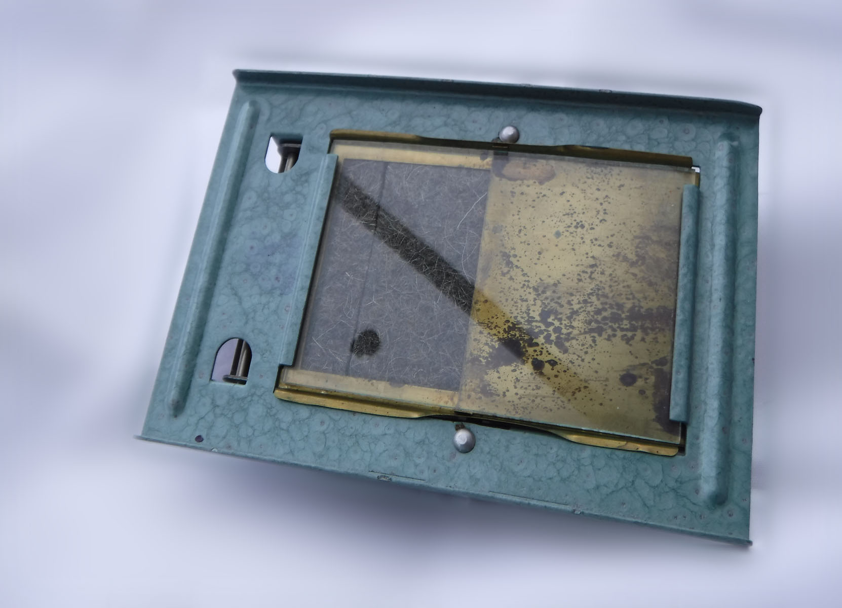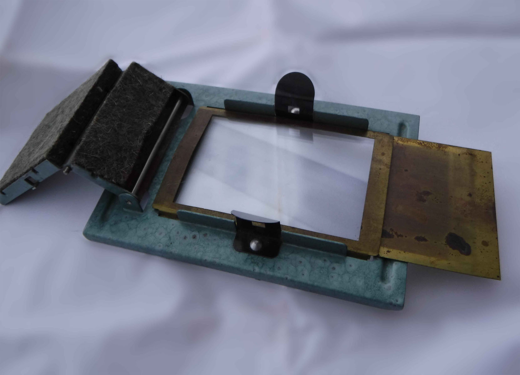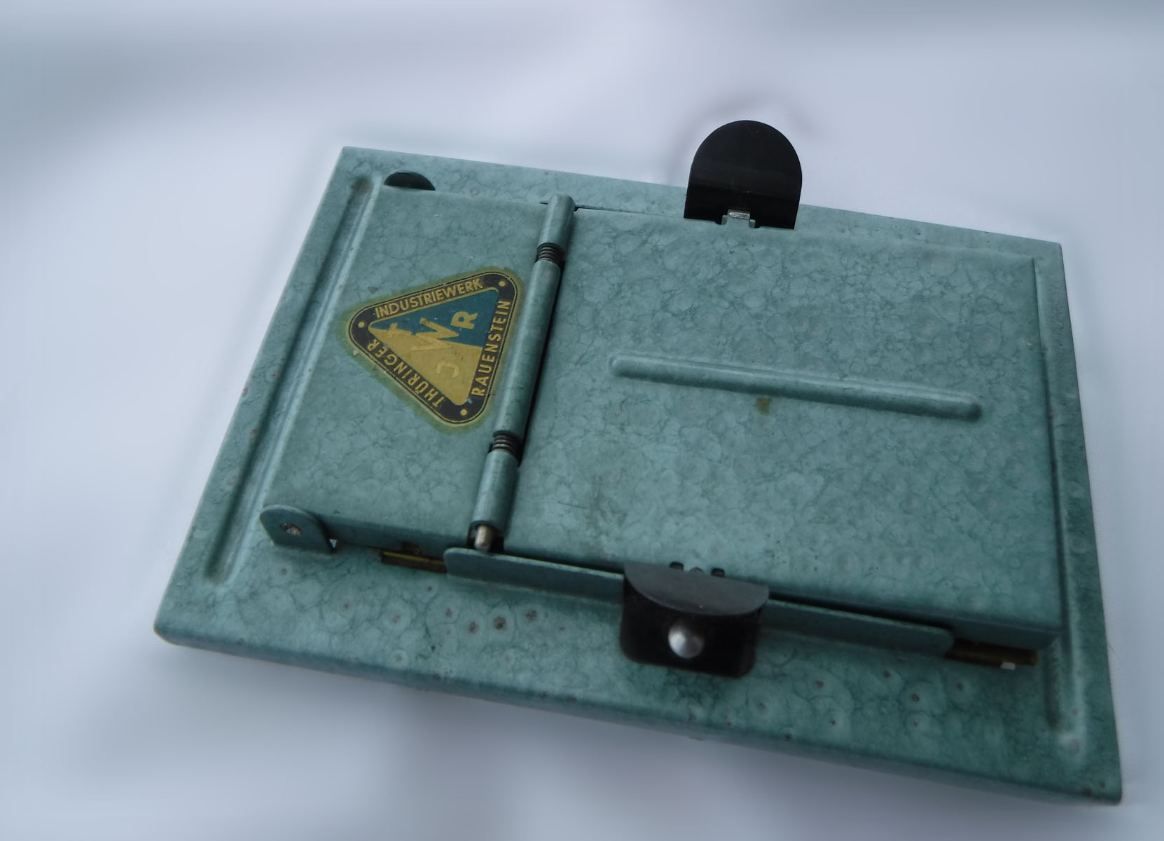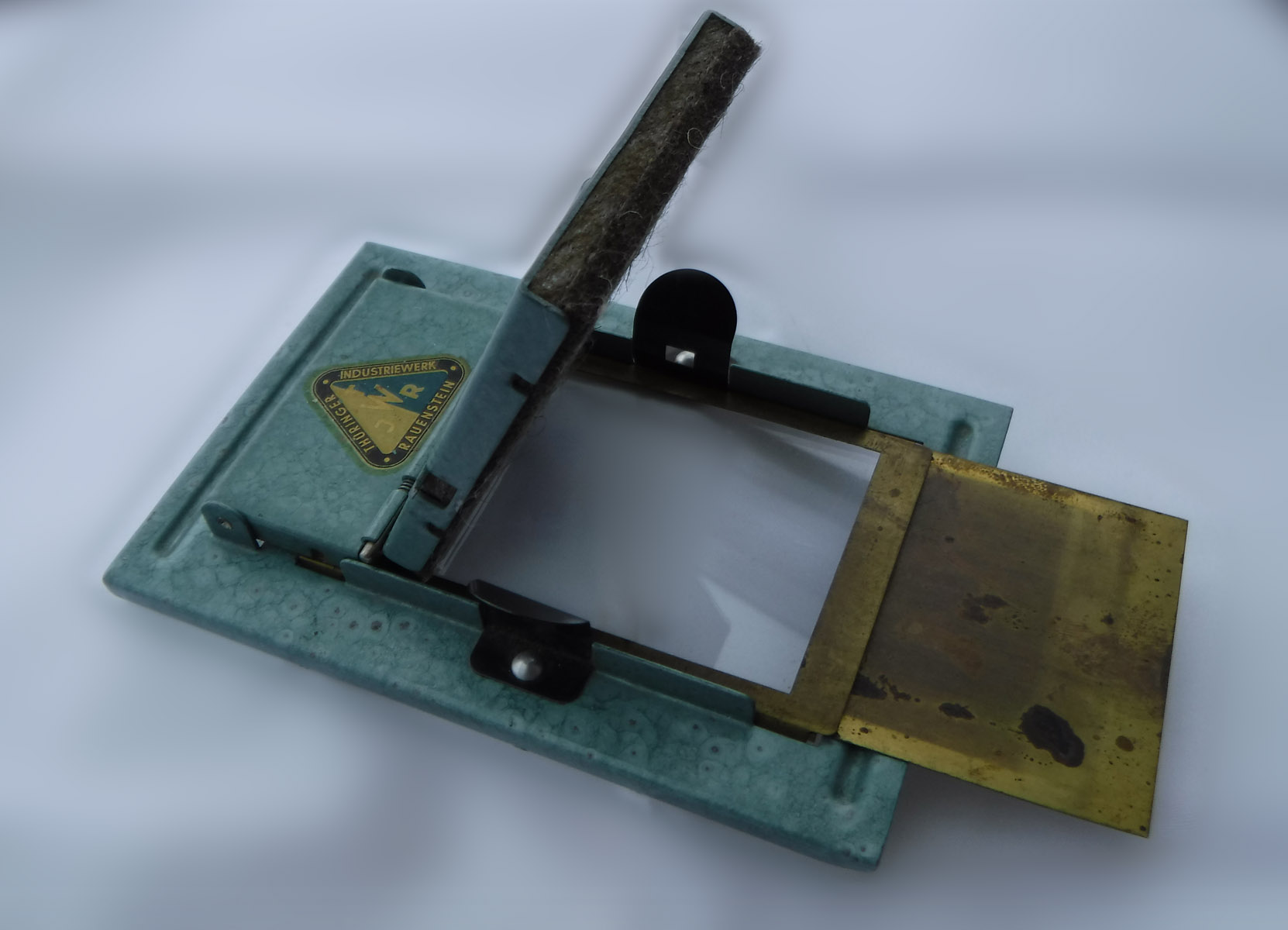Das Teil stammt aus einem Konvolut Fotokram, ich finde es hat mit einer Trockenpresse Ähnlichkeit, ich möchte mir aber nicht vorstellen, wie man damit 36 Abzüge zeitnah und ohne Wärmezufuhr trocknen soll. Die Glasfläche ist 7 x 10 cm, ein kleines aber nicht unübliches Fotopapiermaß. Der Messingschieber lässt sich hin und herschieben, geht aber nicht vollständig ab. Die Firma stellt Prüf- und Messtechnik her, es gibt sie immer noch, heißt jetzt nur anders. Das dreieckige Logo ist schon sehr alt, 50er Jahre oder so.