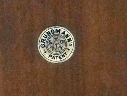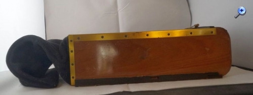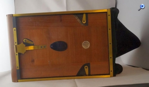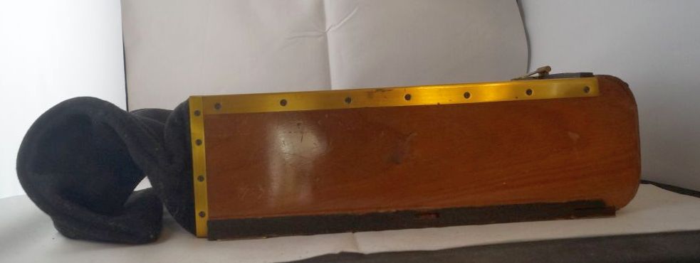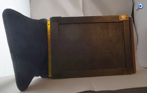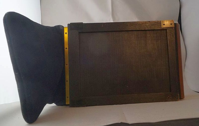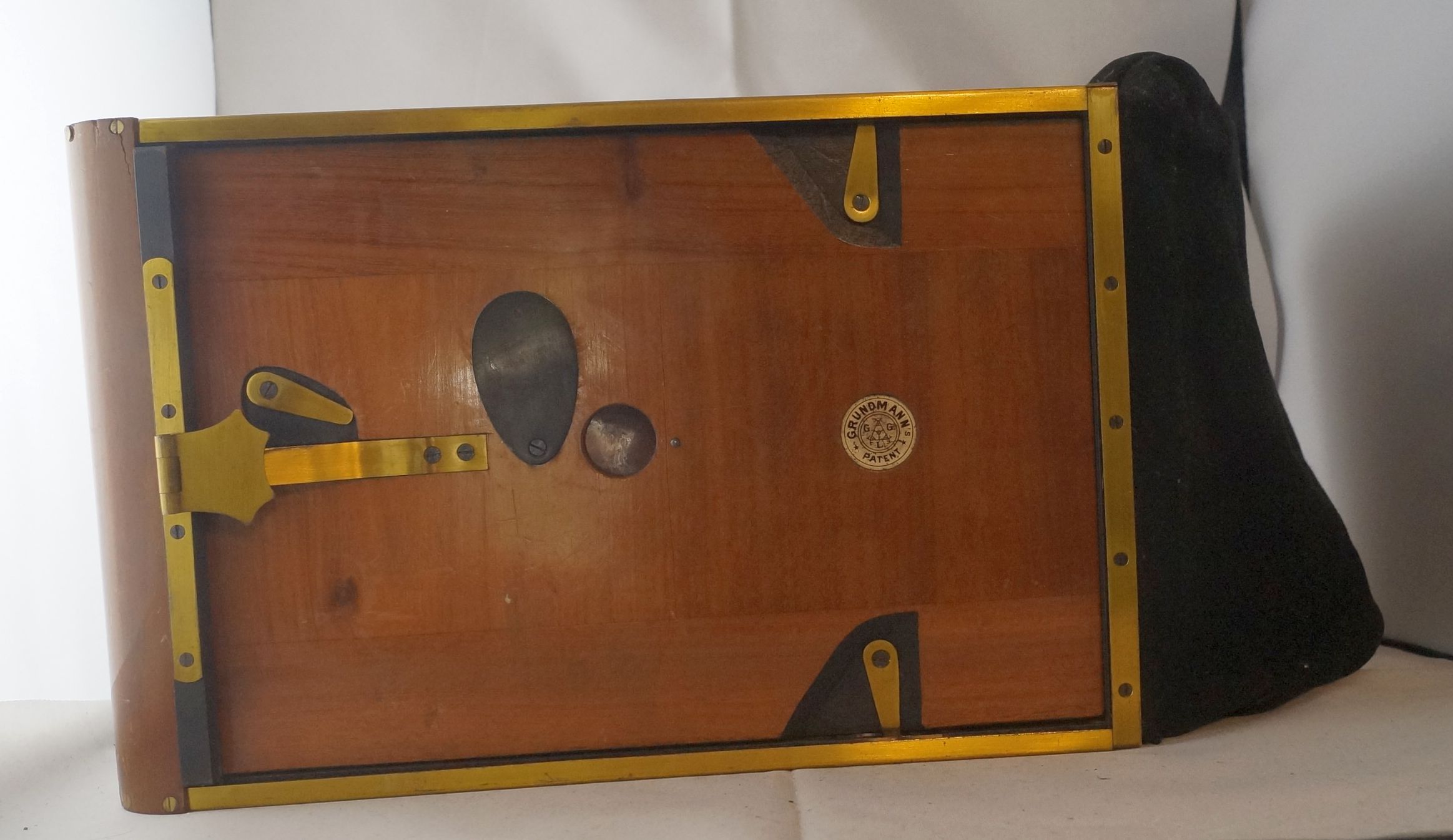 So, nun das zweite Teil, bei dem es sich um eine Art Plattenmagazin zu handeln scheint, innen sind insgesamt 12 Plattenhalter und durch ein verschließbares Guckloch ( Bild eins und zwei ) lässt sich die Nummer erkennen. Am unteren Ende ist eine Art Stoffsack, meiner meinung nach, um die jeweils belichtete Platte reinfallen zu lassen, so das man die nächste belichten kann. Die Platte lässt sich jeweils durch das öffnen einer Rolladen ( Die kleine Messinglasche links auf Bild 1 wird heruntergezogen) Belichten, wie das Fallen in den Sack vorgeht weiss ich leider nicht, vielleicht braucht man die Passende Kamera, das ganze hat an der Vorderseite ein Logo, Grundmann Patent. Ich denke das Logo steht für Gebr. Grundmann Leibzig, konnte aber, ausser das es ein spezial Fotohaus gab, nichts dazu finden.