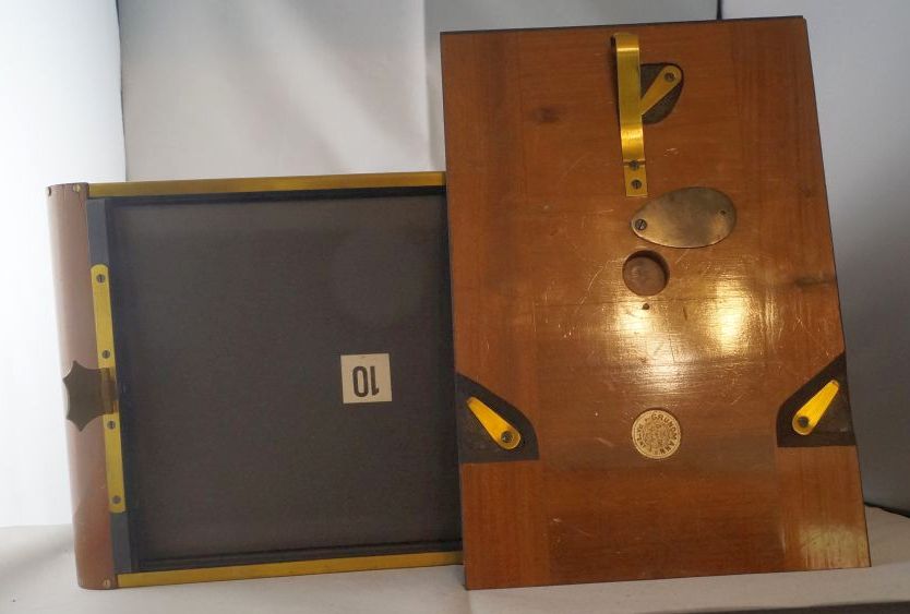 Hallo, nach emsigen suchen habe ich zumindest zum zweiten Teil etwas gefunden, auch wenn ich ausser ein paar Schemazeichnungen nichts gefunden habe. Es handelt sich wohl um eine Jalousie Magazinkasette. Zwar habe ich beides zusammen nicht gefunden, aber es gab Jalousiekasetten für größere Atelierkameras und Magazinkasetten, für mehrere Plattenhalter. Das Format der Plattenhalter ist 9 x 18, was zu einer Atelier Kamera passen würde und auch eine Magazinkasette würde hier Sinn machen. Aber wie gesagt, eine Abbildung oder Info die das Teil genau beschreibt habe ich nicht gefunden, daher währe ich für alles nähere Dankbar.