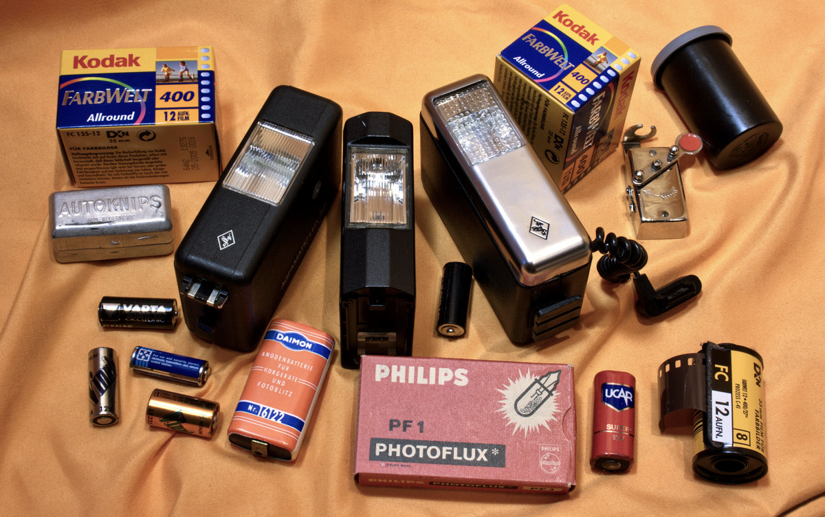 Ein Foto mit Zubehör für Kleinbild- und Kompaktkameras: von links nach rechts/oben: Kleinbild Farbfilm ISO 400 Aluschachtel für den "Autoknips" verschiedene Blitzgeräte für Kompaktkameras Kleinbild Farbfilm ISO 400 "Autoknips", mechanische Zeitsteuerung (Selbstauslöser) für Drahtauslöser leere Filmdose