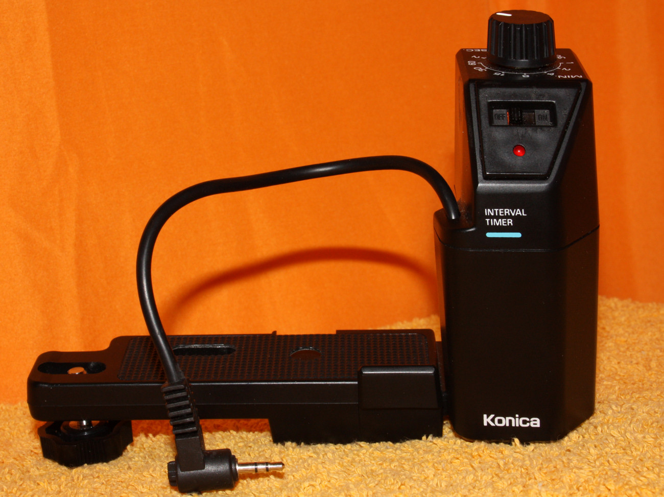In einer anderen Auktion ist mir für 1 Euro plus Versand ein Timer von Konica in die Hände gefallen. Ich habe den Originalstecker samt Kabel gegen einen für die EOS 450D passenden ausgetauscht und nun einen idealen Intervalltimer für Zeitrafferaufnahmen, vom Extra-Handgriff ganz zu schweigen. Die Montageschiene hat mehrere Bohrungen und Langlöcher für die unterschiedlichsten Kameraformen. Er wird mit 2 AA-Batterien betrieben, ein Batteriesatz reicht für mehrere zehntausend Aufnahmen. Folgende Einstellungen sind möglich: eine Aufnahme alle