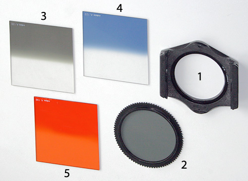 1 Filterhalter mit auswechselbarer Schraubfassung 2 Polarisationsfilter, im Filterhalter drehbar 3 Verlaufsfilter grau, zum Abdunkeln des Himmels 4 Verlaufsfilter blau, zum Verstärken des blauen Himmels 5 Sunsetfilter, zur natürlichen Wiedergabe von Sonnenuntergängen