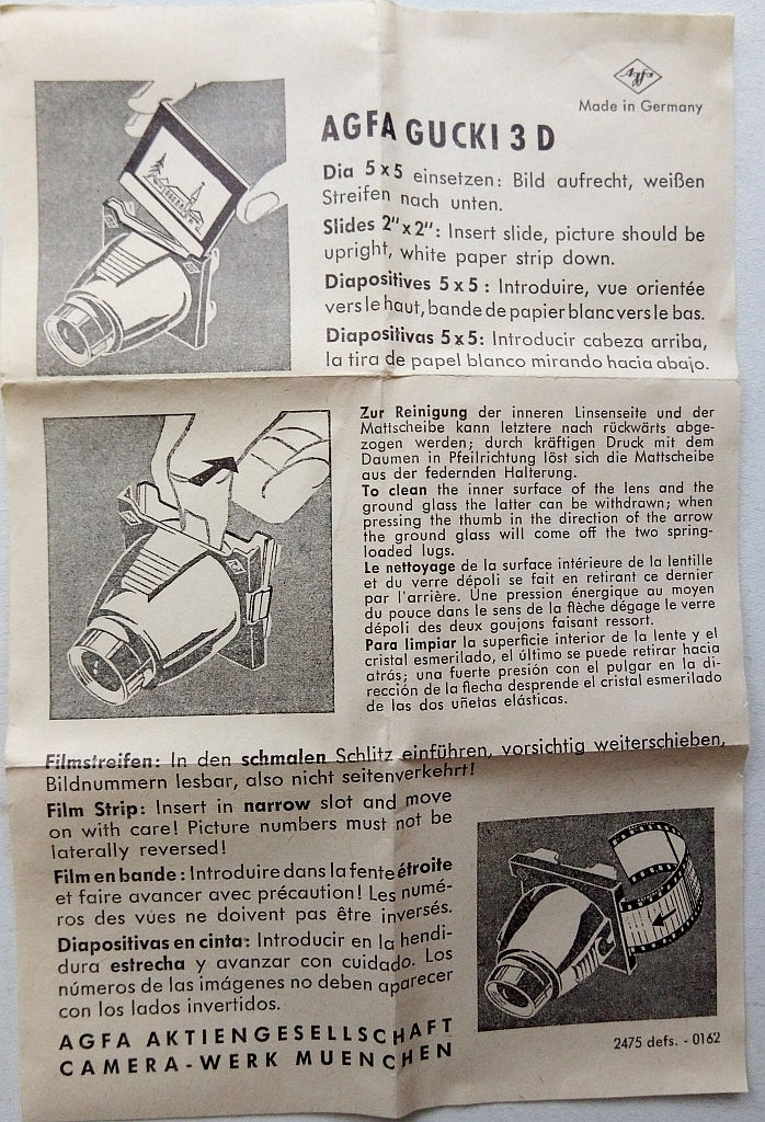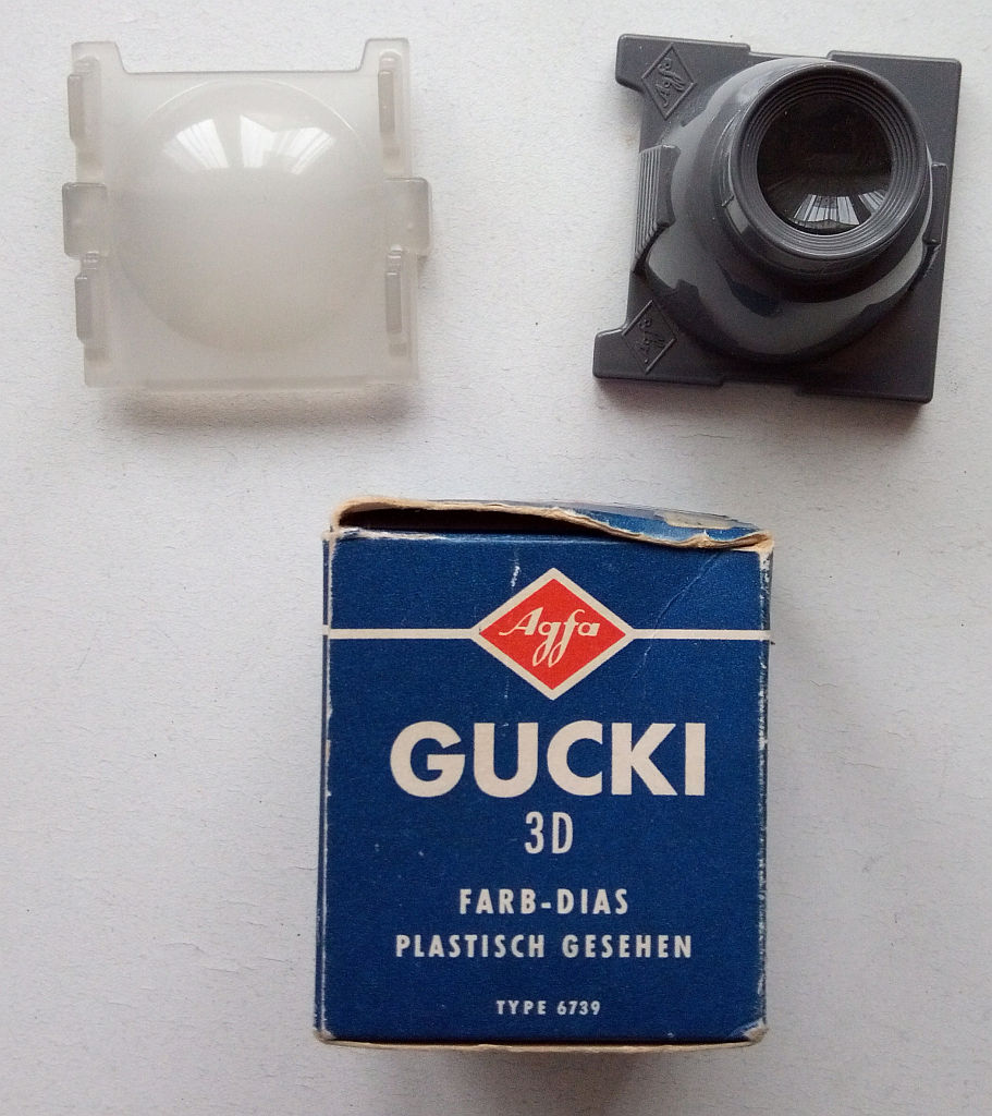 Den habe ich in schlechter Erinnerung. Das mag so um 1956 gewesen sein, als ich mir in ca. der zweiten Volksschulklasse auf dem Heimweg von der Schule nach dem Gucki am Schaufenster des Fotoladens in Planegg wochenlang die Nase platt drückte. Dann kam Zahltag, zwei Mark vom Vater, um fünfzig Pfennig von der Mutter aus dem Haushalts- oder ihrem eigenen Taschengeld aufgestockt, und ich war stolzer Besitzer eines nagelneuen Agfa Gucki, stand doch da was von großen Bildern in leuchtenden Farben, überall anwendbar und ohne Batterie. Bloß, als ich anderntags wieder hinging und fragte, wo denn die Bilder seien, sagten sie mir, die müsse ich selber machen. Ups...? Ich hatte mir wohl vorgestellt, das sei sowas wie ein View Master, bei dem ja ein oder zwei Bildscheiben mitgeliefert wurden. Eine Fehlinvestition von einem Monatsetat! Immerhin kriegte ich ein paar Jahre später als junger Fotofan den einen oder anderen Film geschenkt und verschmähte den auch nicht, wenn sich da jemand zu einem Diafilm verstieg (welche arme Ostpreussenfamilie hatte wohl einen Kleinbild-Diaprojektor?). Mit dem Gucki konnte ich mir die wenigstens angucken, bis ich den Nikon LS1000 Scanner hatte, in dessen Aufnahme nämlich nicht nur der Negativhalter, sondern auch 5x5 Diarähmchen passen.