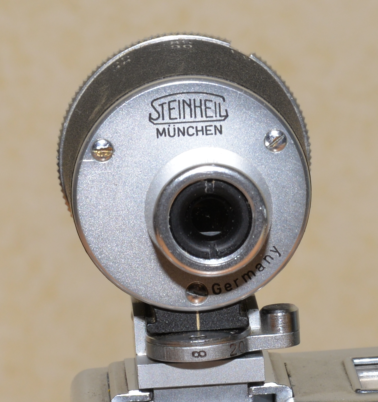Aufstecksucher waren für die frühen Meßsucher-Kameras wichtige Zubehörteile wenn der Bildausschnitt der verfügbaren Wechselobjektive genau kontrolliert werden sollte. Selbstverständlich gab es diese Sucher als Original-Ersatzteil der jeweiligen Kamerahersteller. Preisbewusste Kunden kauften trotzdem gerne bei Fremdanbietern um die ein oder andere D-Mark zu sparen. Es konnte aber durchaus sein dass ein "Originalteil" aus der selben Fertigung kam. Hier also der Steinheil-Sucher mit drei Brennweiten die in den 50er Jahren fast das ganze Spektrum der Wechselobjektive abdeckten. Das Gerät macht einen gediegenen Eindruck, mit einer Drittel-Drehung rastet die gewählte Brennweite sauber ein, eine Entfernungseinstellung gibt es auch.