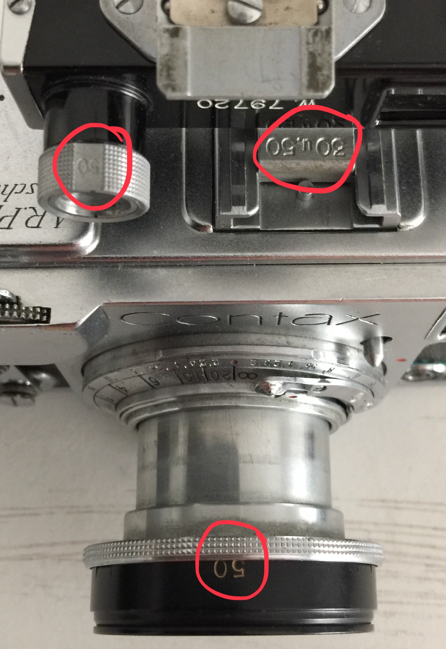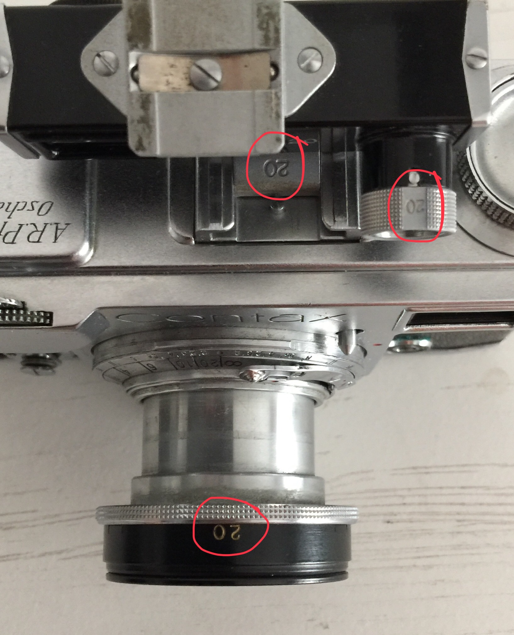 Die Zahlen entsprechen der Aufnahmeentfernung (20 = 20cm, 30 = 33cm, 50 = 50cm) nun Belichtungszeit und Blende einstellen, durch den Aufsatzsucher blicken und wenn die beiden Schnittbilder sich decken ist die korrekte Aufnahmeentfernung erreicht.
