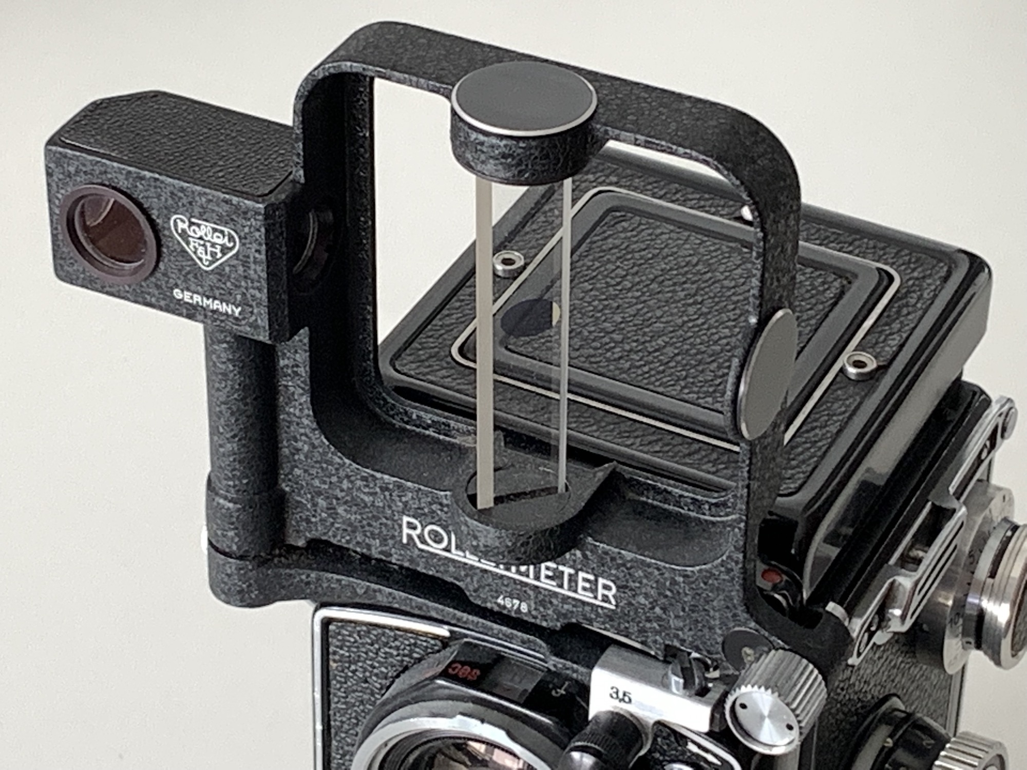 auch wenn bei der zweiäugigen Rolleiflex die Objetkive nicht gewechselt werden können, ist es doch eine Systemkamera – es gibt eine ganze Reihe von Zubehör- und Anbauteilen; für Sammler ein reichhaltiges Betätigungsfeld. Hier als Beispiel der Entfernungsmesser "Rolleimeter" – damit konnte die TLR zur Entfernungsmesserkamera umgerüstet werden: