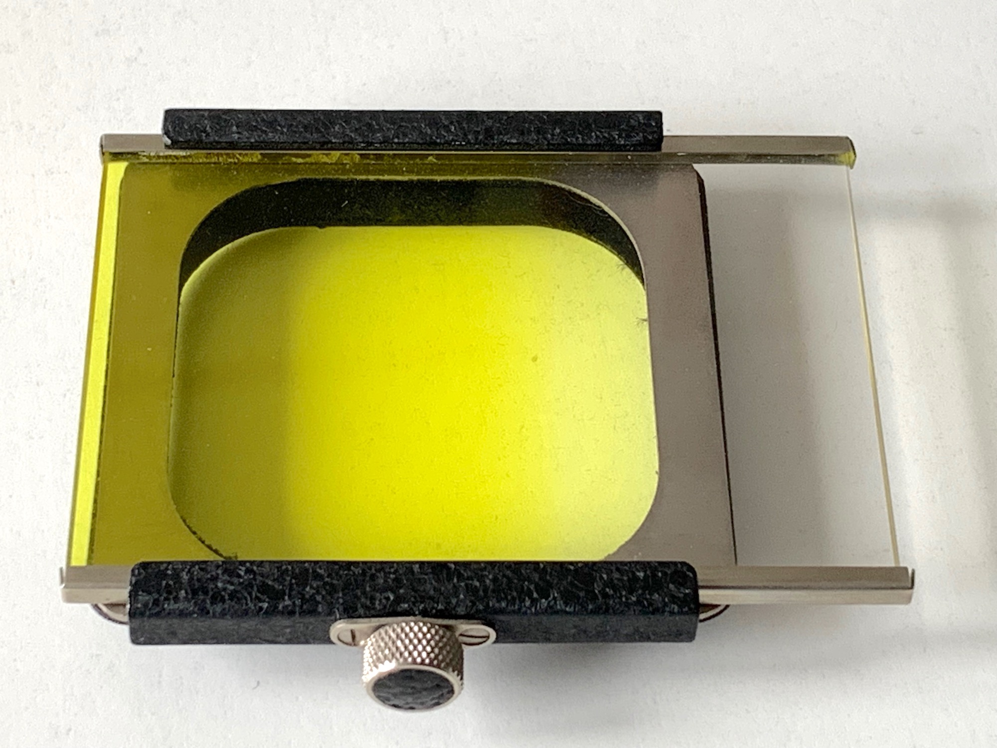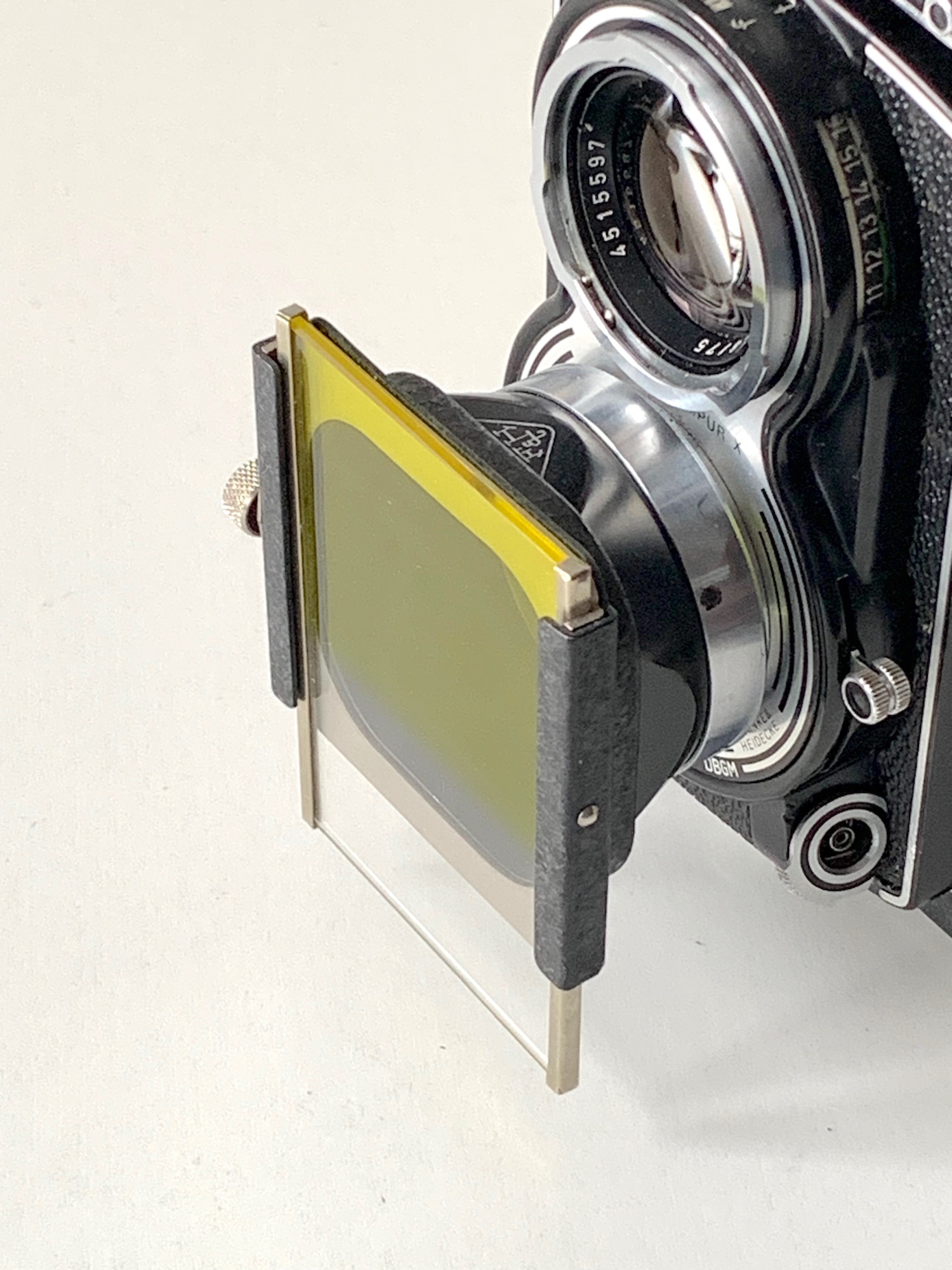 Gelbfilter werden in der sw-Fotografie zur Kontraststeigerung, u.a. zur Abdunkelung des Himmels eingesetzt. Wenn nur Himmelspartien betroffen sein sollen, kommen Verlauffilter zum Einsatz. Bei Franke & Heidecke hat man sich eine Besonderheit einfallen lassen: Ein Gelbverlauffilter, bei dem der Verlauf durch mechanische Verschiebung gesteuert werden kann. Das Filter sitzt in einem Rahmen, der auf die Streulichtblende der Rollei gesteckt wird, und kann vertikal verschoben werden. Das Filter war in drei Größen (für die unterschiedlichen Abmessungen der Streulichtblenden) erhältlich, hier zu sehen an einer Gegenlichtblende mit Baj. I an der Rolleiflex T. Die raffinierte Konstruktion war nur kurze Zeit (1951–1953) erhältlich, sie wurde für 28,50 DM angeboten.