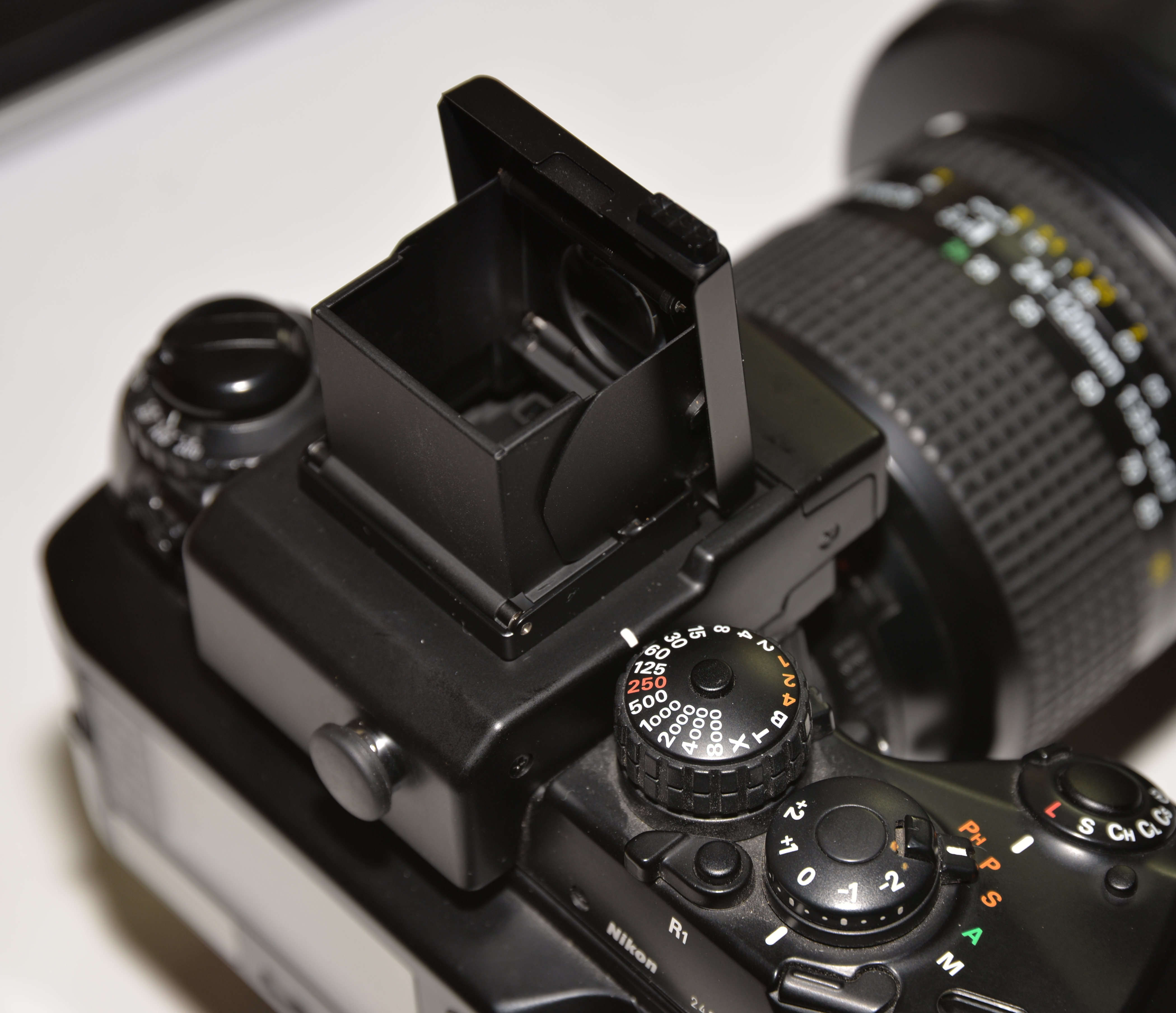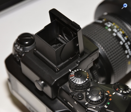 Mehr kann man von einem Lichtschachtsucher nicht erwarten, zumal er die wuchtige Kamera ein kleines Stück leichter macht. Autofokusbetrieb ist möglich, das Meßsystem wird automatisch auf Spotmessung eingestellt. Ein Blitzanschluß für Nikon TTL Geräte ist auf der Rückseite angebracht.