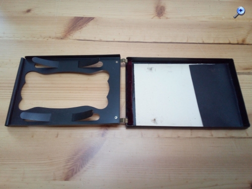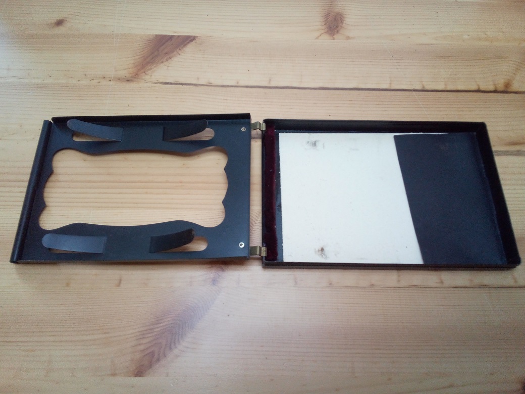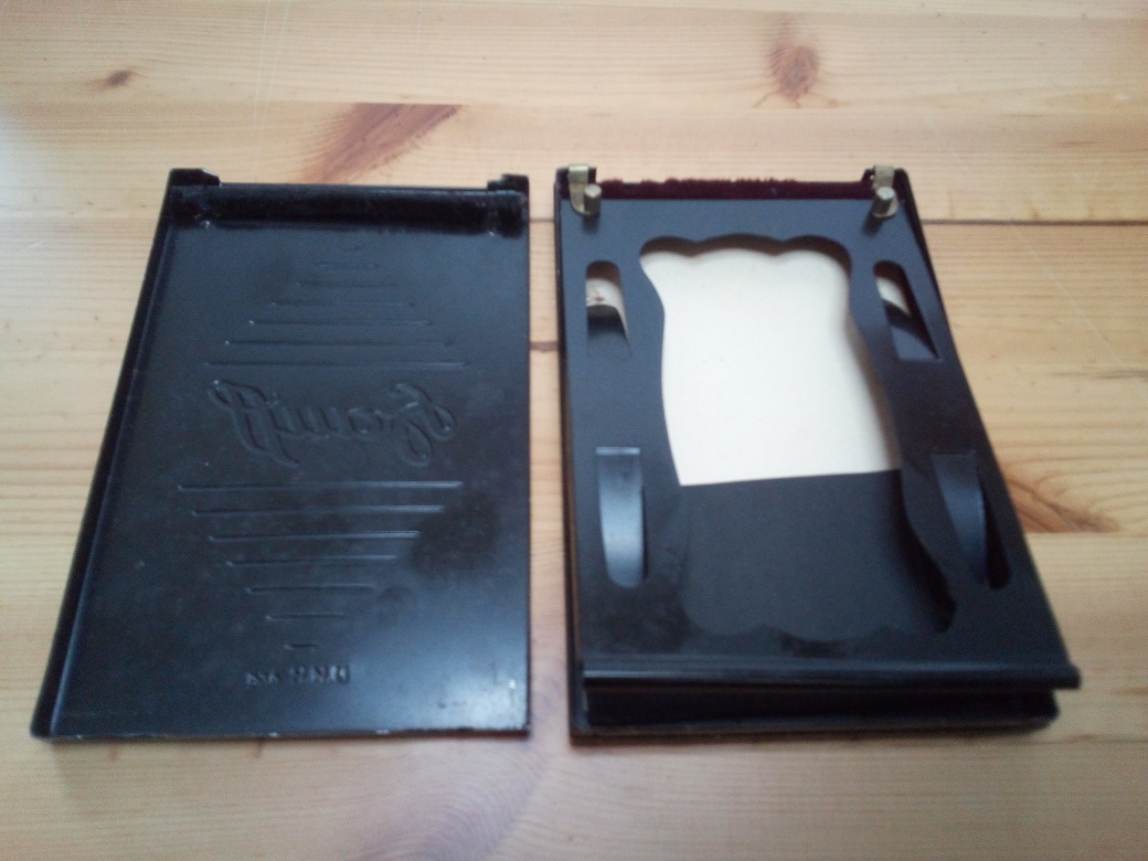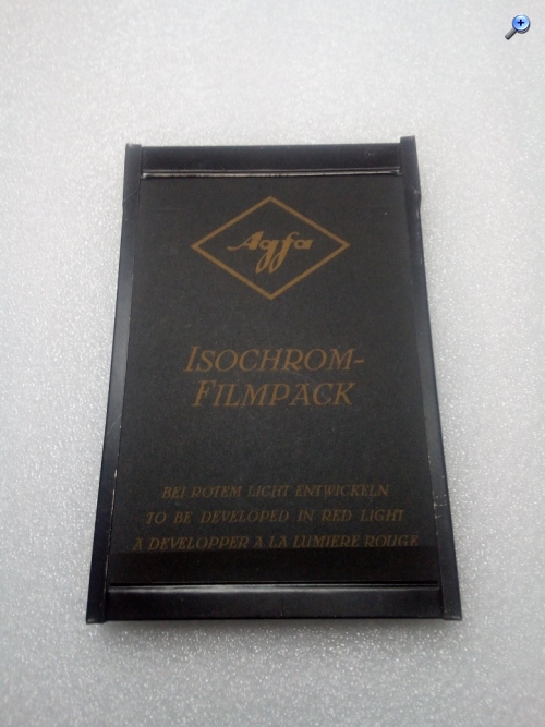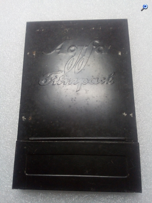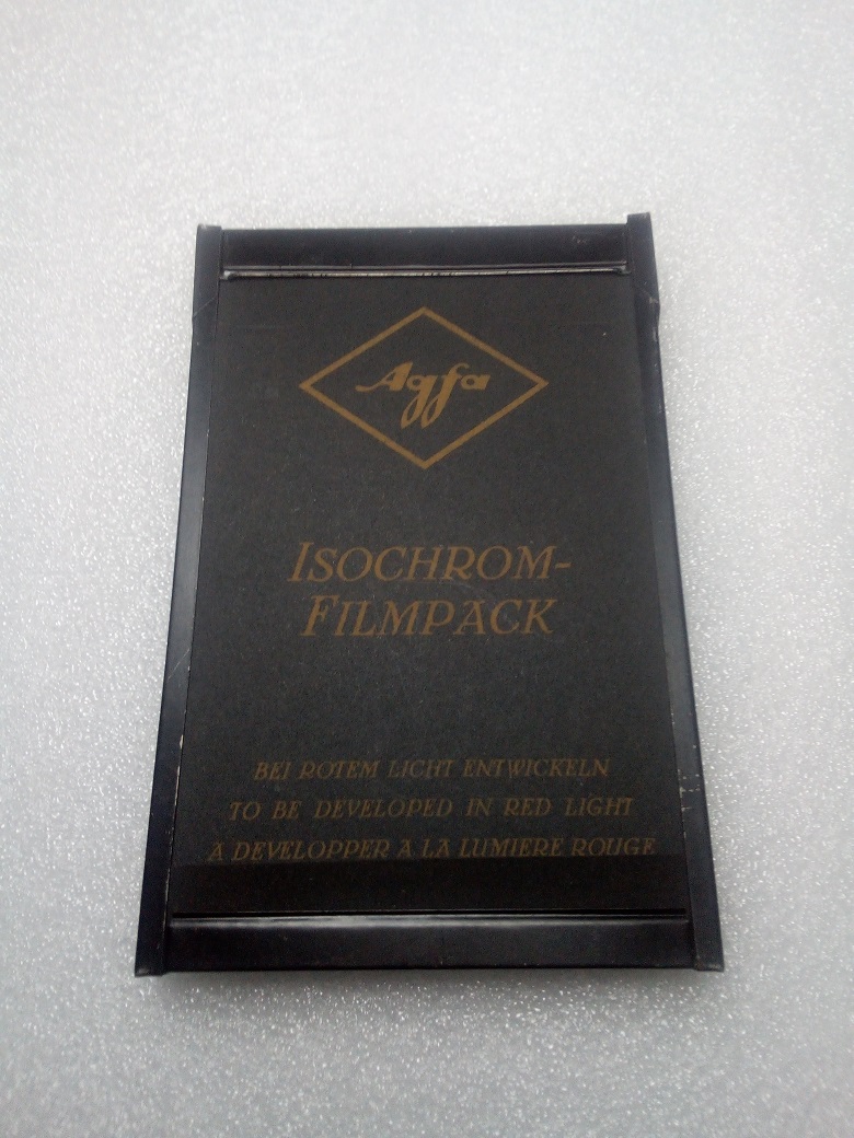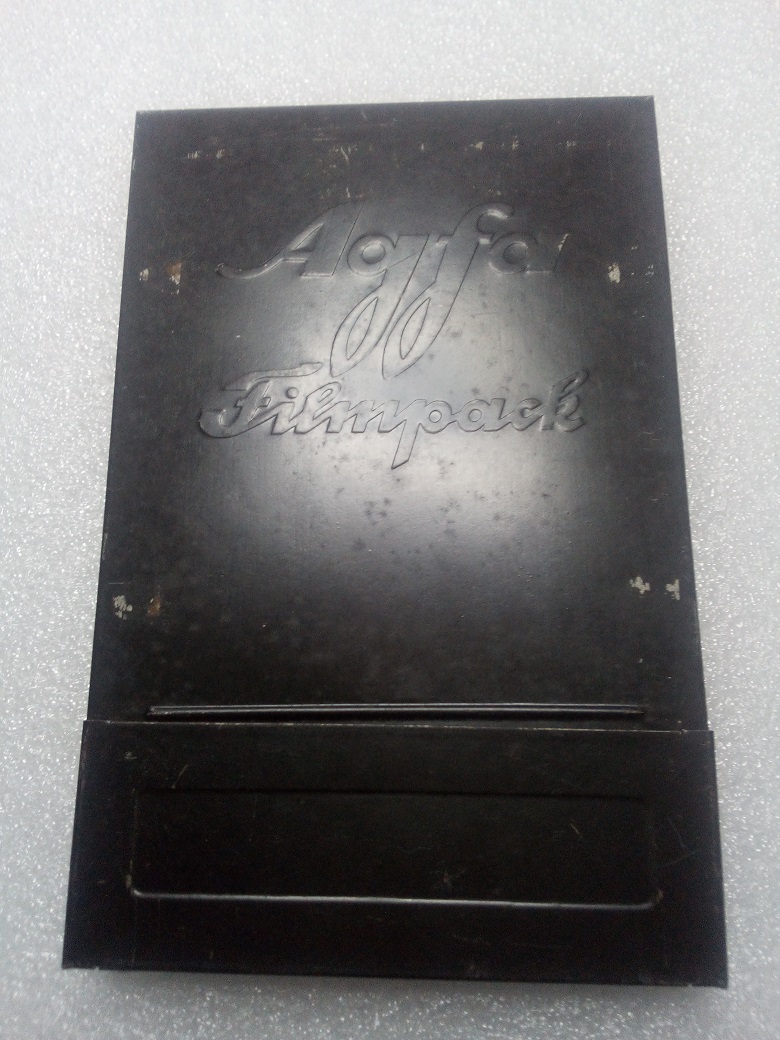 mir scheint, dass es sich hier nicht um eine Filmpackkassette (die alternativ zu den Einzel-/Doppelkassetten für Platten an der Kamera befestigt wird) handelt, sondern um die Hülle des Filmpacks, die ihrerseits die Planfilmstreifeen enthält und in eine Kassette eingelegt wird. Diese Hüllen sind aus Blech oder steifer Pappe, haben keinen Falz und tragen i.d.R. die Namen der Filmhersteller. Die Packfilmkassetten der Kamerahersteller hatten auf der Rückseite oftmals eine Aussparung, damit Hersteller/Filmtyp abgelesen werden konnten.