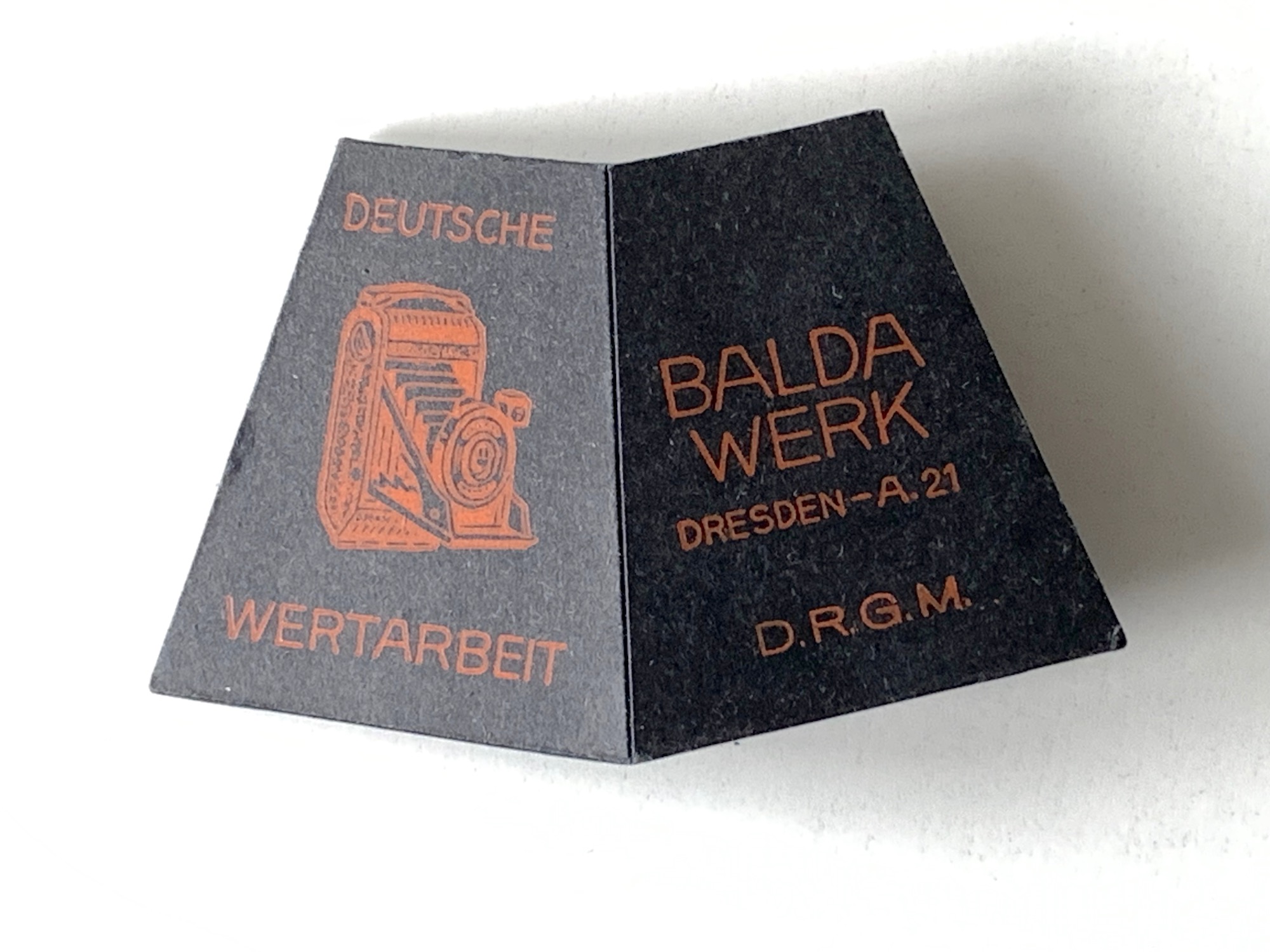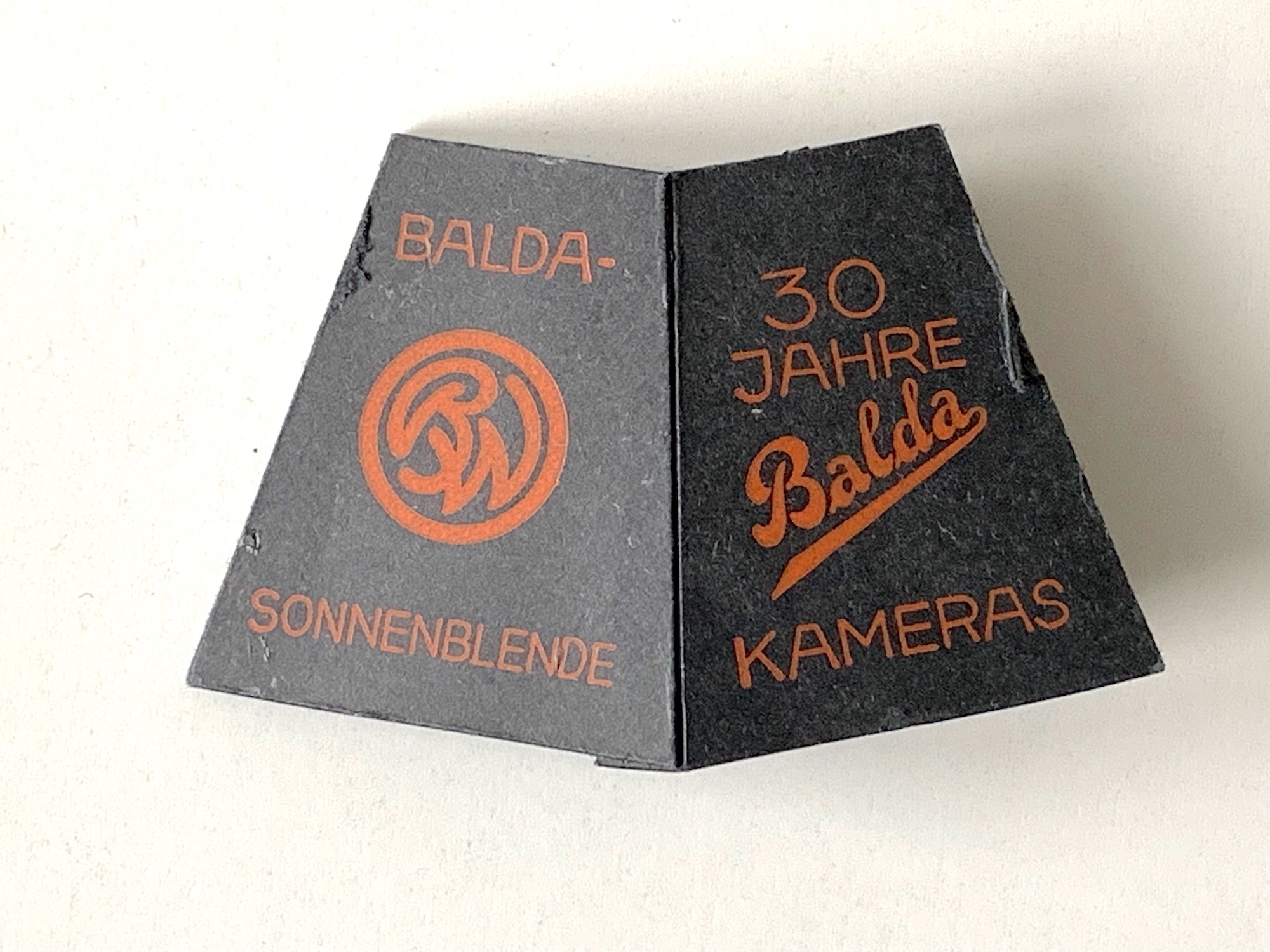 zum 30jährigen Bestehen der Fa. Balda (Max Baldeweg, Dresden) im Jahr 1938 gab es nicht nur das Jubiläumsmodell Jubilette (Kleinbildkamera, vereinfachte Version der Baldina: https://blende-und-zeit.sirutor-und-comp...&thread=387), sondern (wohl als Werbegeschenk) auch eine Gegenlichtblende aus Pappe, die man auf Objektive mit Ø 25 mm aufstecken konnte: