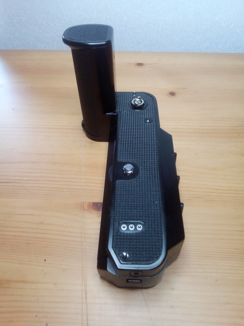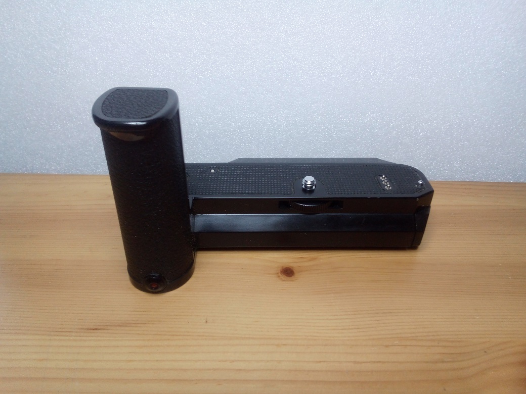 Auf der Oberseite sind die elektrischen Kontakte, die Befestigungsschraube und der Motoreingriff für die Filmaufwickelspule zu sehen