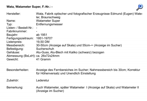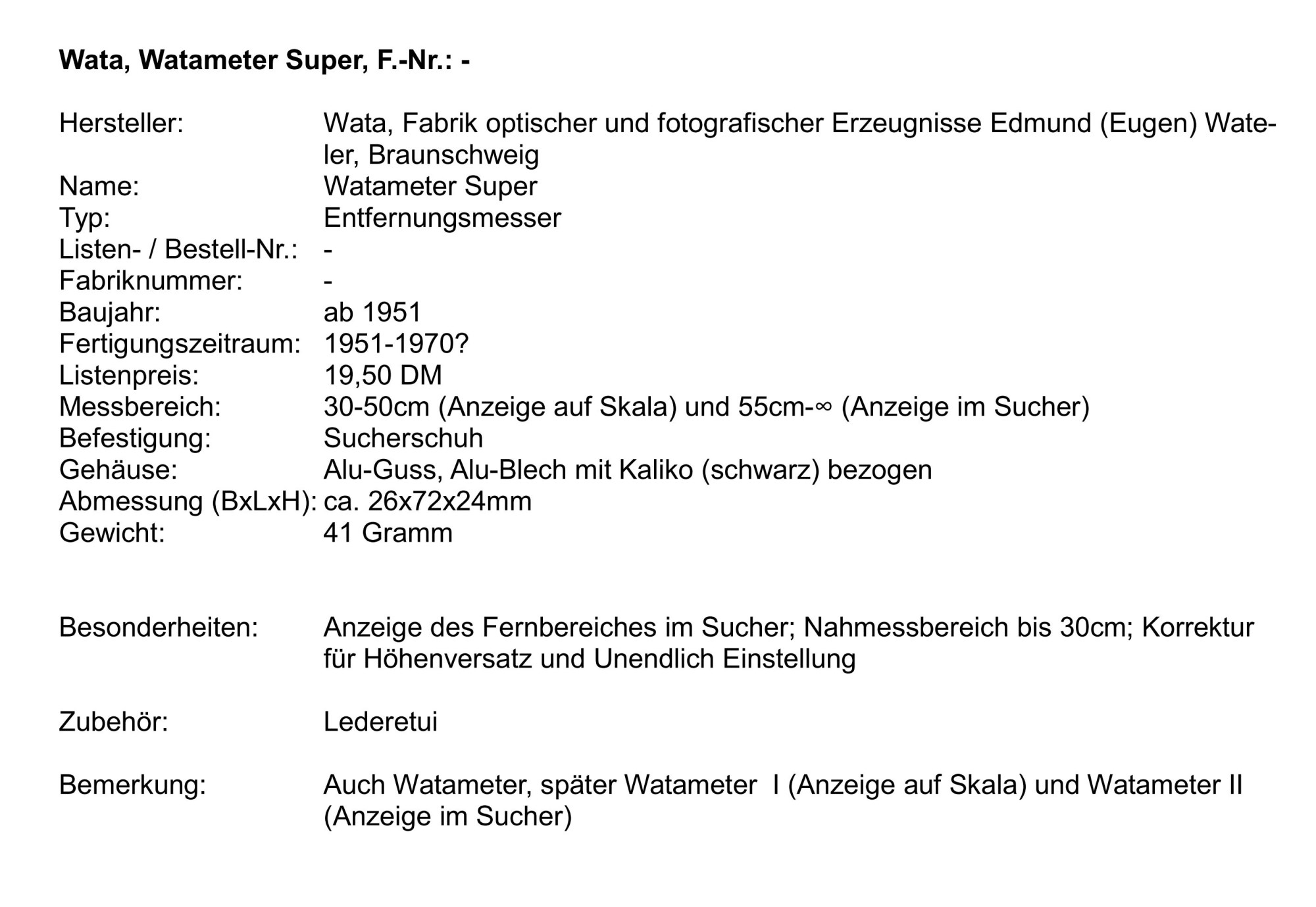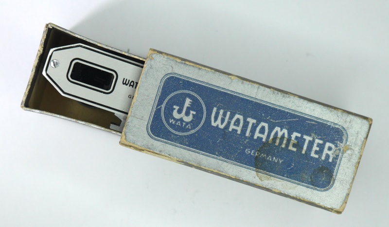 Hier ein Entfernungsmesser aus meiner Jugendzeit, der Watameter Super. Hersteller war die Firma WATA, Fabrik optischer und fotografischer Erzeugnisse, Braunschweig, die kurz nach 1945 von Edmund Wateler gegründet wurde. Er war vor 1945 viele Jahre in mehrere Filmfirmen im Verkauf und Vertrieb tätig, nach dem Zusammenbruch ergriff er die Gelegenheit sich Selbstständig zu machen. Die Firma befasste sich mit der Fabrikation von fotografischem Zubehör, wie Vakublitzgeräte, Blitzadapter, Entfernungsmesser und Vergrößerungshilfen (Watamat).