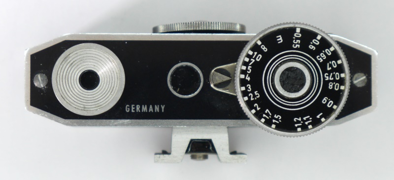 Der Messbereich des Belichtungsmessers ist mir unklar. Die Ermittlung der Helligkeit erfolgt über die Erkennung einer von 5 Ziffern unterschiedlicher Graustufen, zusätzlich muss noch die Umge-bungshelligkeit geschätzt und drei Symbolen auf der Einstellscheibe zugeordnet werden. Den Sym-bolen entsprechend wird eine der drei Filmempfindlichkeiten, 17, 20 oder 23 DIN/10 der noch lesbaren Ziffer gegenübergestellt und es ergeben sich dann die Zeit-/Blendenkombinationen.