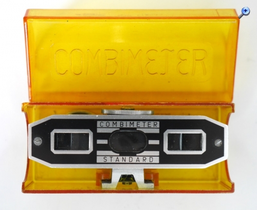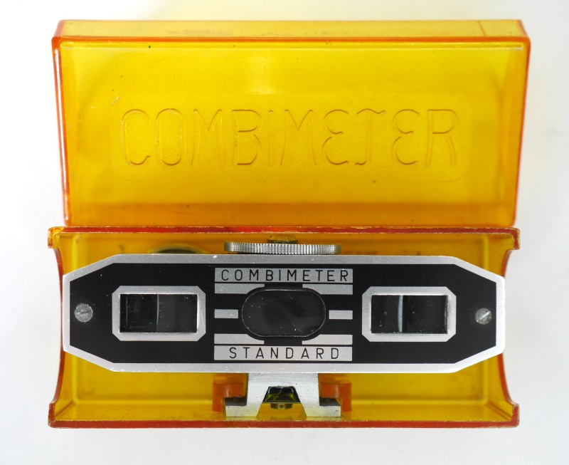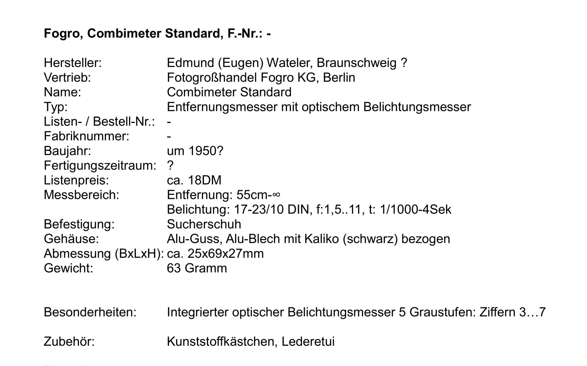 Hier ein Wanderer zwischen den Welten, der oder das Combimeter Standard. Ein Entfernungsmesser und optischer Belichtungsmesser, vertrieben vom Fotogroßhandel Fogro KG, Berlin. Der Hersteller war vermutlich die Firma Wata, Braunschweig, im Aufbau ähnelt er stark den Watametern.