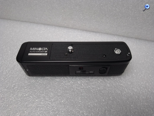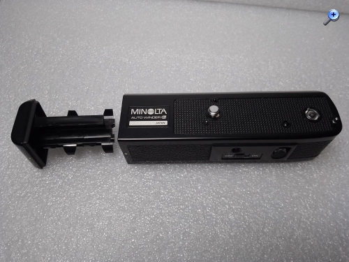 Hersteller: Minolta, Japan Modell: Auto Winder G Typ: Motorwinder für Einzel- und Serienbilder, max. 2 Bilder / sec. Baujahr: 1980er Jahre Seriennummer: 2666298 Stromversorgung: 4 x 1,5 AA Batterien Abmessungen: 35 x 37 x 138 mm Gewicht (ohne Batterien): 210 Gramm Neupreis (1981): 238,-- DM