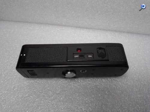 Rückseite: weiße Punkte für den korrekten Sitz des Batteriefachdeckels, OFF / ON Schalter (darüber rote Kontrolleuchte), Entsperrschalter für den Filmrücktransport