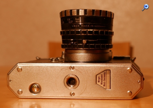 Die "2000" wurde angeblich aus Restbeständen gebaut. Was sie von der C unterscheidet, erschließt sich mir nicht. Hier dient sie ohnehin nur als "Sockel" für das Objektiv. Über der Blendenzahl 8 sieht man am Bild ein kleines Fenster, das je nach Einstellung (Schieber) "A" oder "M" anzeigt. Das Objektiv erscheint mir extrem schwer und wertig. Über die Kunststoffobjektive von ISCO kann ich nicht viel sagen.