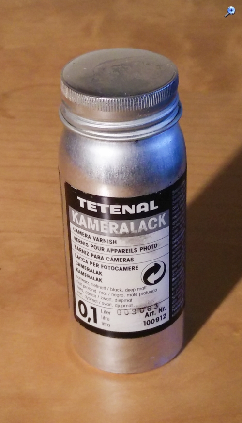 Das Problem dabei, aber auch bei jeder Lack-Arbeit auf der Welt, ist, das Werkstück gleichmäßig mit ausreichend viel Lack, aber nicht soviel, dass er zu Tropfen oder Vorhängen läuft, und auch nicht so wenig, daß kein Material da ist, die Pinselstriche zu füllen, zu beschichten. Aber das kennen wir wohl alle. Vor 50 Jahren war übrigens "schwarzer Kameralack" im normalen Verkaufsprogramm der Fotohandlungen. Er hatte einen gemäßigten, d.h. glänzenden Seidenlack-Effekt. Habe ihn aber seit 10-20 Jahren nirgends mehr angeboten gesehen.