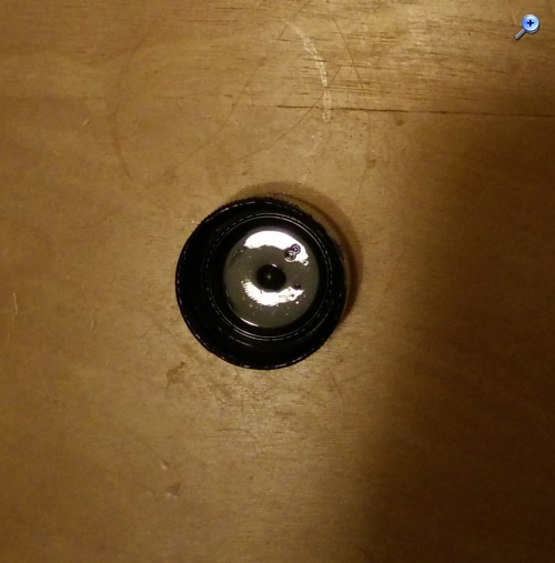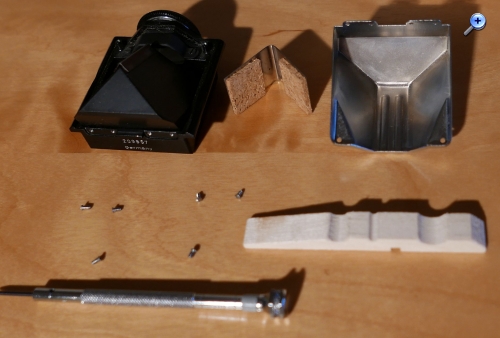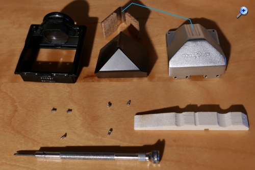 Das Prisma habe ich glücklicherweise sehr günstig bekommen (20 €, aus Berlin). Es hatte links oben eine kleine Delle, die ich mit Hilfe einer halben Wäscheklammer und einem Hammer ausklopfen konnte. Man muss bei solchen Arbeiten sehr gefühlvoll zu Werke gehen, damit keine Verschlimmbesserung entsteht. Zu zimperlich darf man natürlich auch nicht sein, sonst tut sich nicht viel.