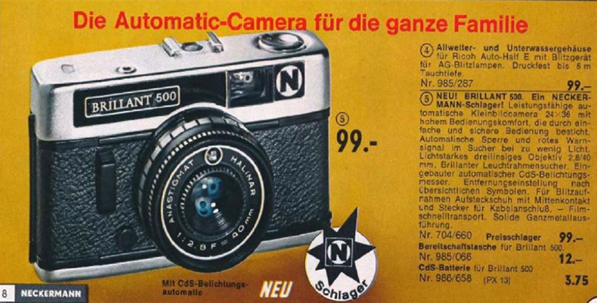 Hier als Bildzitat aus dem Katalog 1971 die Brillant 500 mit N-Symbol für Neckermann. Mit Hallinar Objektiv, hergestellt wahrscheinlich von Hallina (Hawking) Hong Kong. Zwar nicht Neckermann, aber immerhin "N" ...