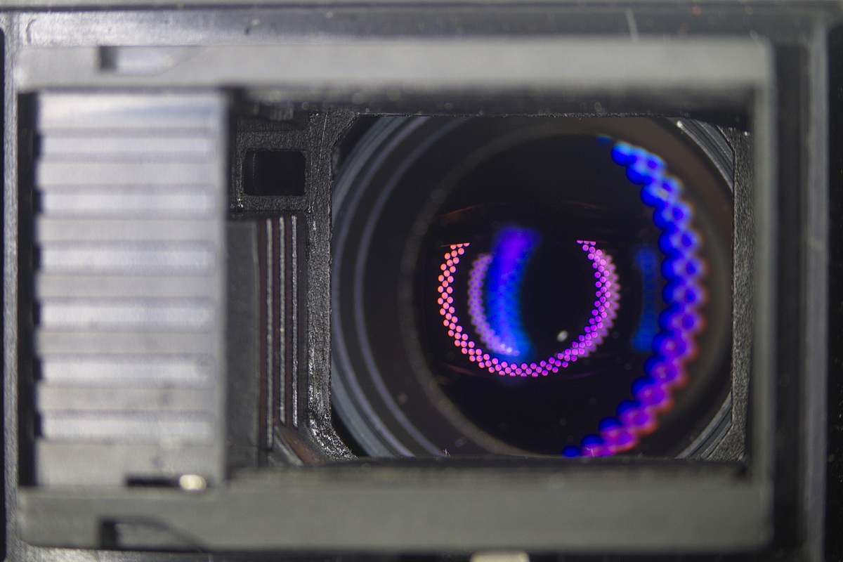 Da ist noch eine ganze Menge Platz, um (wilde Vermutung) beim Auslösen eine orangene Birne, wie eine auch für die Batteriekontrolle an der 110ED ist, aufleuchten zu lassen, sofern die Rädchen nicht auf "neutral" = undurchsichtig gestellt sind, und deren Durchlicht durch drei Zahlenscheiben auf einen teildurchlässigen Spiegel im Objektivtrakt strahlen zu lassen.