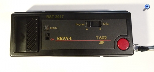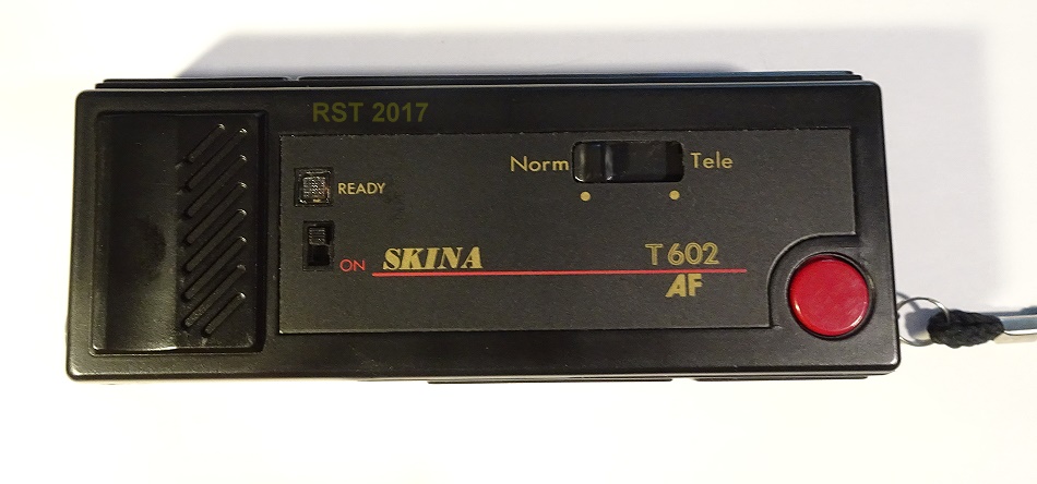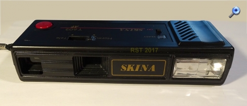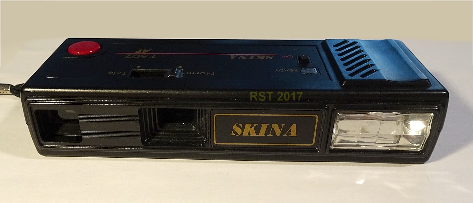 diese Pocket-Kamera für das 110-Film-Format verfügt über eine interne Wechseloptik (Normal und Tele) und einem integrierten einschaltbarem Elektronenblitzgerät. Made in China. Die Kamera hat keine Bildbeeinflussungsmöglichkeit und keine Parallaxenmarke. Batterien für Blitz: 2 x AA. Trageriemen.