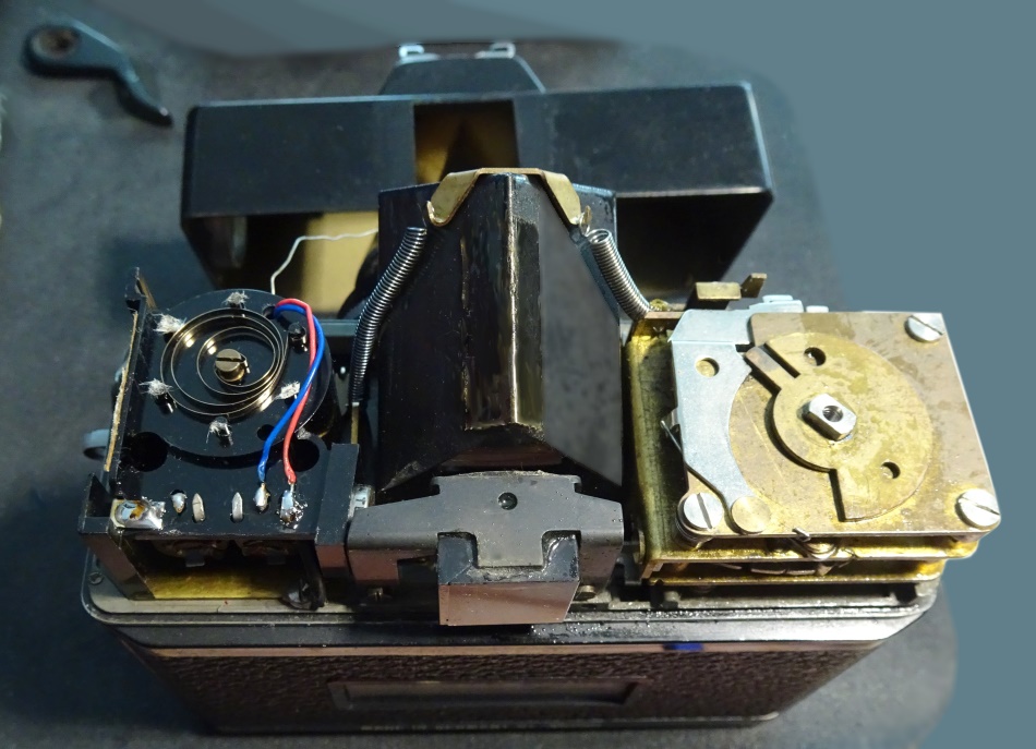 Dabei stellte sich heraus, dass die Mechanik am Filmtransporthebel zu arbeiten scheint aber die Herunterleitung zur Verschlußeinheit am Objektiv nicht funktioniert.