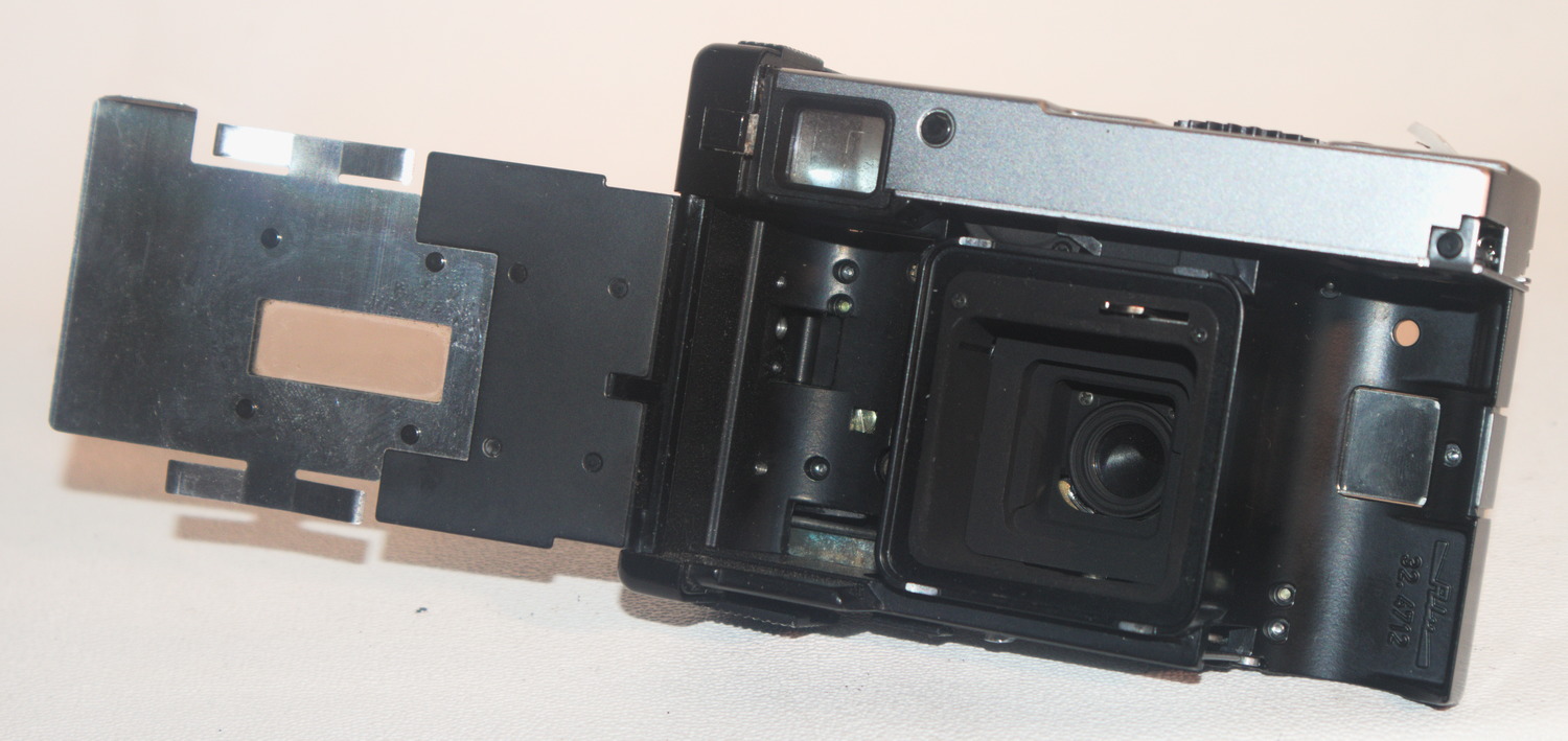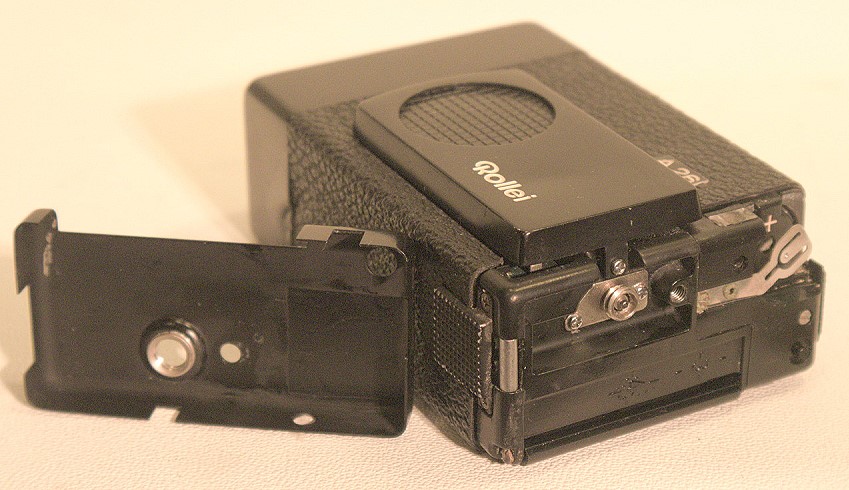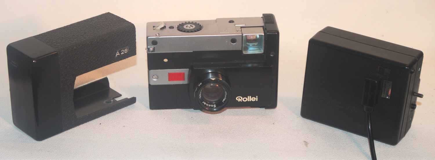 Und jetzt habe ich ein weiteres Problem. Es gibt zum einen offenbar mehr Sammler mit Schraubenschlitzkomplex. Zum anderen weiß ich nicht, was zu tun ist, um die Kamera so weit zu öffnen, daß der Sucher gesäubert werden kann. Der ist nämlich durch die Säure auch merklich getrübt (was aber sicher leicht zu putzen wäre, käme man hin ...). Zum dritten dürfte es einige Arbeit sein, die dann bei Verkauf sowieso kaum zu 1€/h, ggf. aber zum Otti-Satz (Totalverlust wg. mit Lupe erkennbar betätigter Schraube) belohnt würde.*) Soweit ich das ohne Kenntnis dieser Kamera und ohne Filmkassette beurteilen kann, dürften Blitz und Kamera trotz allem noch funktionsfähig sein. Die Kamera löst aus, die Blitzkontrolllampe leuchtet nach Einschalten des Blitzes auch Tage nach dem Laden auf. Von Hand auslösen kann man ihn im Gegensatz zu einem Rollei E15-Blitz einer Rollei 35 leider nicht, und auch die Kontrolle der Belichtungsautomatik dieser insgesamt bei aller Raffinesse doch etwas seltsamen Knipsmaschine erscheint ohne Kassette eh nicht möglich. Gut, die Kassetten gibt's sowieso nicht mehr. Interessant ist diese Kamera hauptsächlich als Vorbote der Welle "hochwertiger" automatischer Knipsmaschinen, die dem Fotografen ein klein wenig Arbeit abzunehmen versprechen zum Preis grotesk verringerter Gestaltungsfähigkeit. So etwa Gestaltungsfähigkeit einer Zeiss-Boxkamera zum Preis etwa einer Praktika Spiegelreflex.