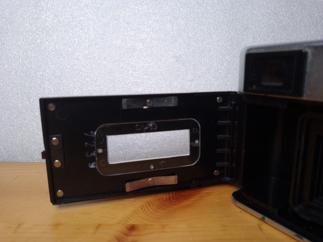Rückseite: Sucher mit Leuchtrahmen, Schnellspannhebel, klappbare Rückwand mit Kontrollfenster und Andruckfedern, Entriegelungsschieber für die Rückwand