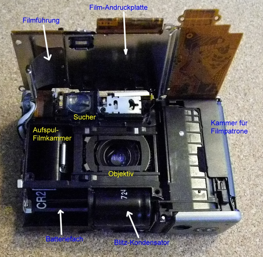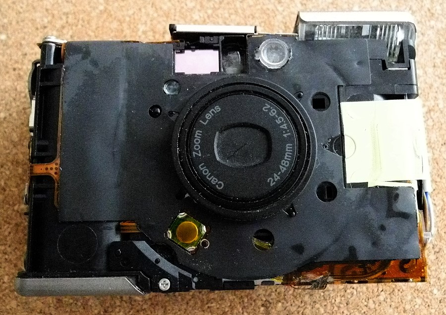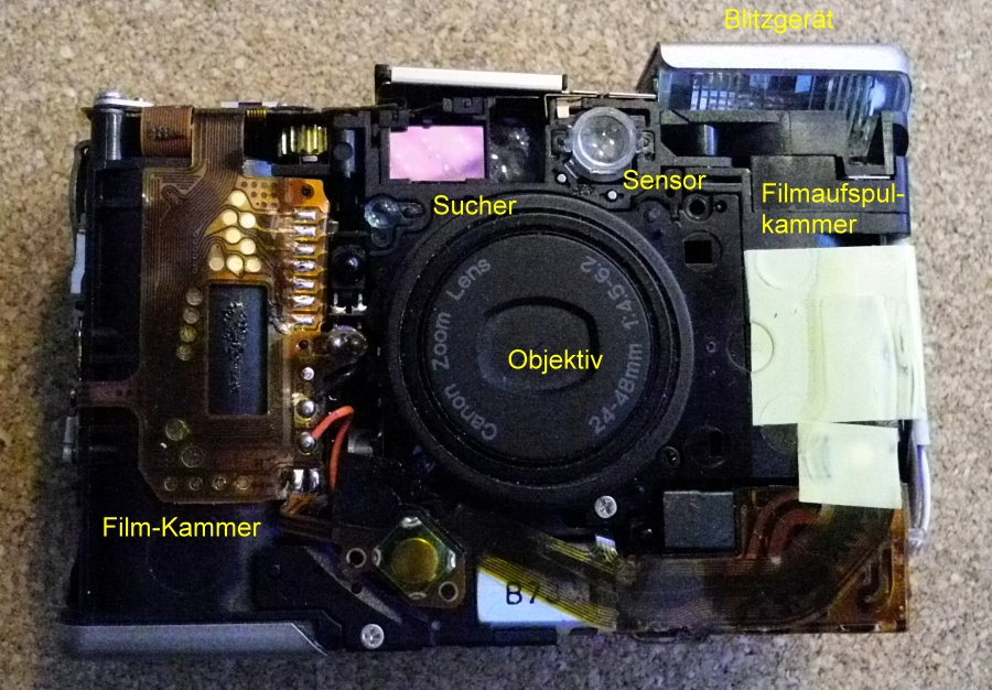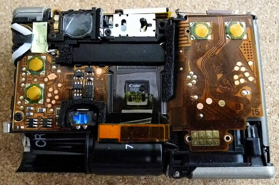 hier noch zwei weitere Photos vom Innenleben der IXUS. Ich bin fast der Meinung, dass man die Kamera nicht zerstörungsfrei demontieren könnte, denn die Folienplatine umhüllt das Chassis so, dass man irgendwann einen Teil der Folie durchtrennen müsste. Vielleicht reichte das System nur zur Montage, aber nicht zur Demontage?