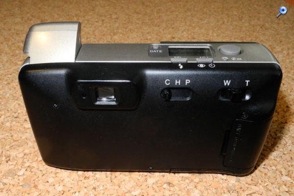 Bedienelemente: Zoom-Tasten, Ein-Aus mit Abdeckung, Auslöser mit Speicherfunktion, Formatwähler, Blitzprogramm, Selbstauslöser, Date, Film-Rücktransport.