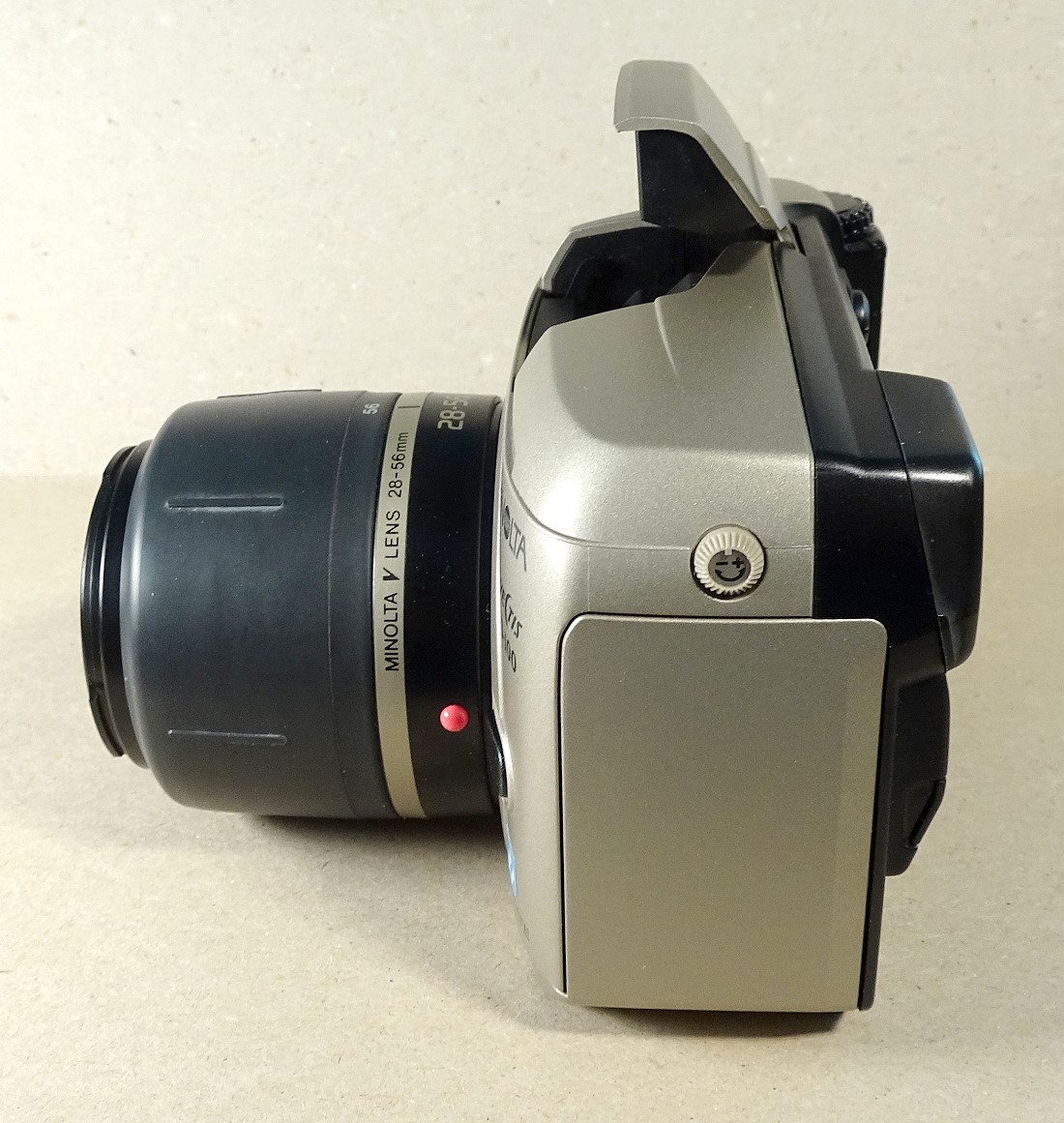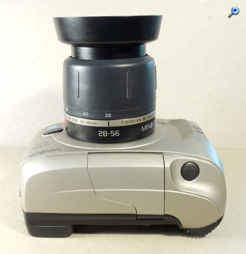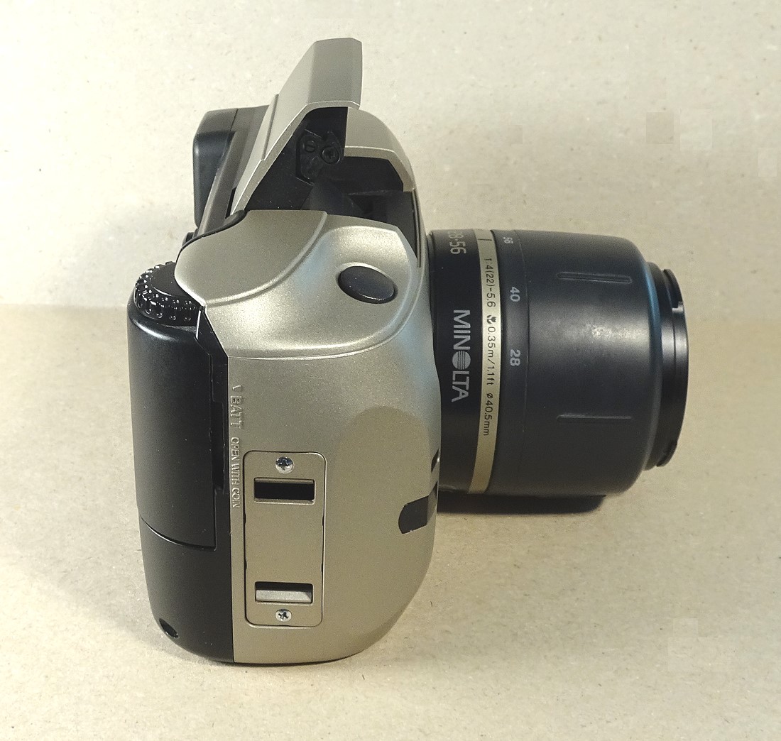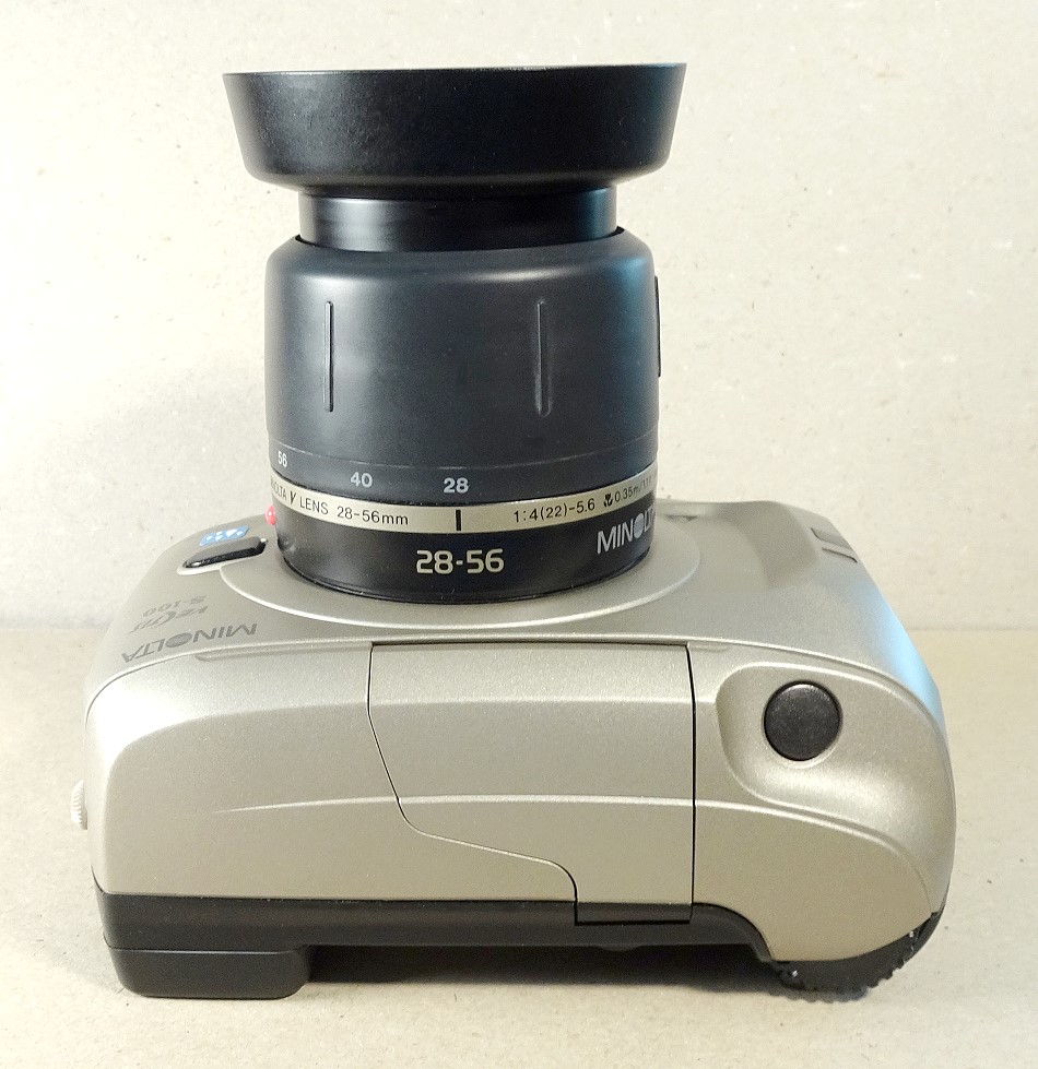 Objektiv: Body mit Minolta V-Bajonett für Wechselobjektive. Hier gezeigt das Minolta V Lens 2-fach Zoom 28-56 / 1:4 - 1:5,6 . 35 cm bis unendlich. Fotos weiter unten ...