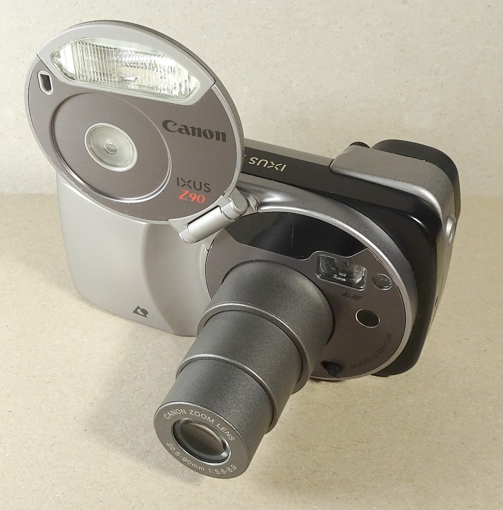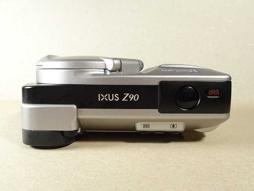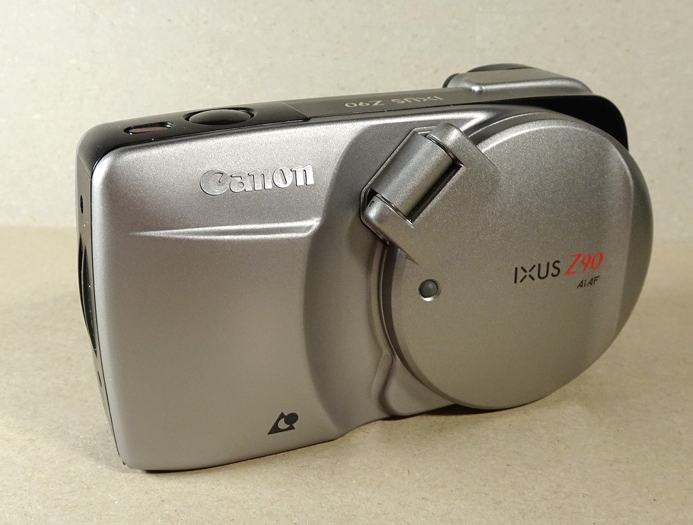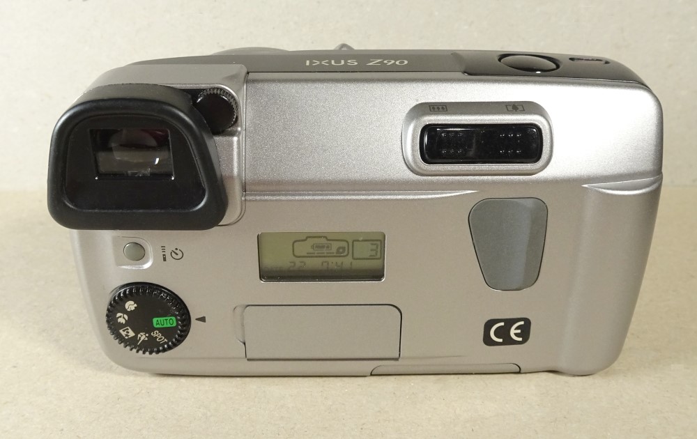 die Canon Ixus Z90 zeigte das fast typische Canon-Design der 90iger Jahre APS-Kameras. Bemerkenswert auch der im Stil der damaligen APS-Modelle von Canon großer Kreis, der hier gleichzeitig die Objektivabdeckung und das Blitzgerät-Teil beherbergte. Beispiele für diese Kreisstruktur bei Canon zeigten auch u.a. diese beiden Modelle (mit allerdings zur 2-fach Zoom):