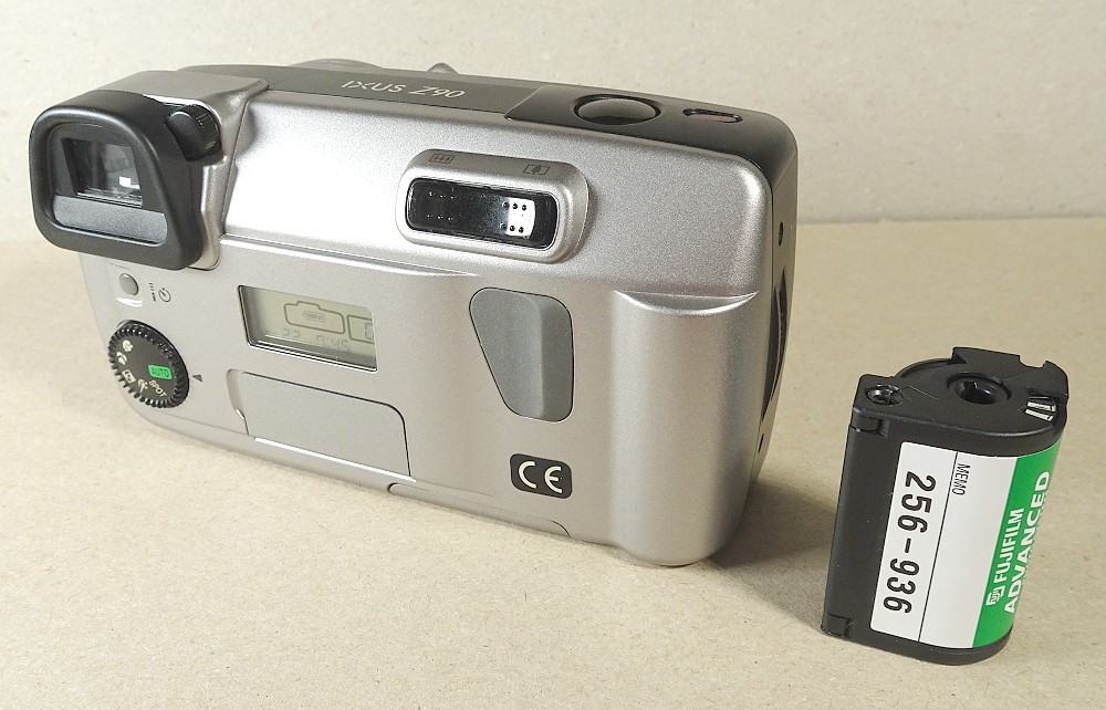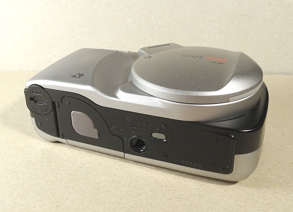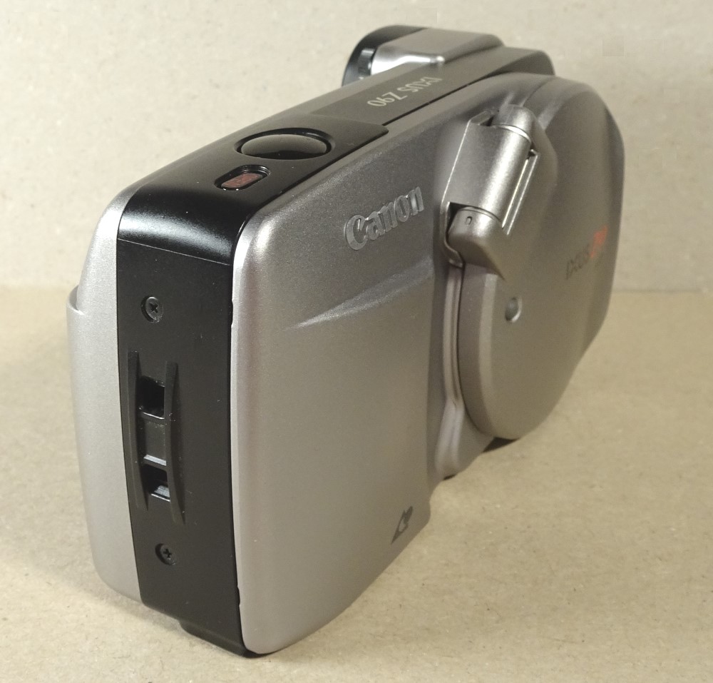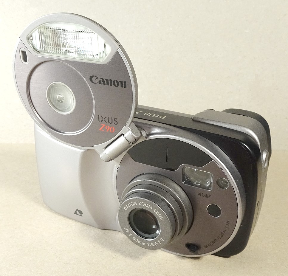 die Canon Ixus Z90 zeigte das fast typische Canon-Design der 90iger Jahre APS-Kameras. Bemerkenswert auch der im Stil der damaligen APS-Modelle von Canon großer Kreis, der hier gleichzeitig die Objektivabdeckung und das Blitzgerät-Teil beherbergte. Beispiele für diese Kreisstruktur bei Canon zeigten auch u.a. diese beiden Modelle (mit allerdings zur 2-fach Zoom):