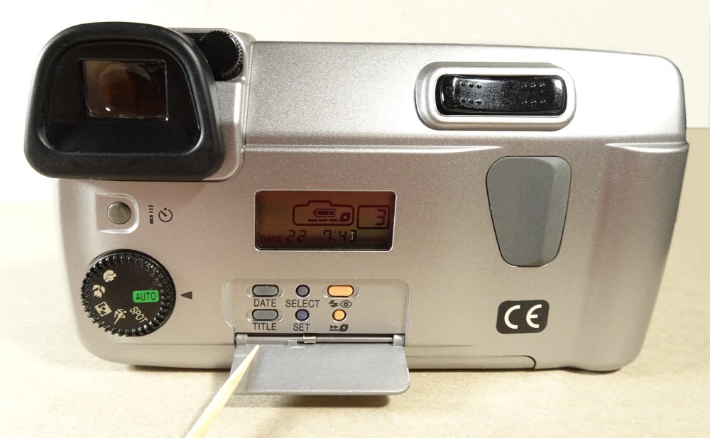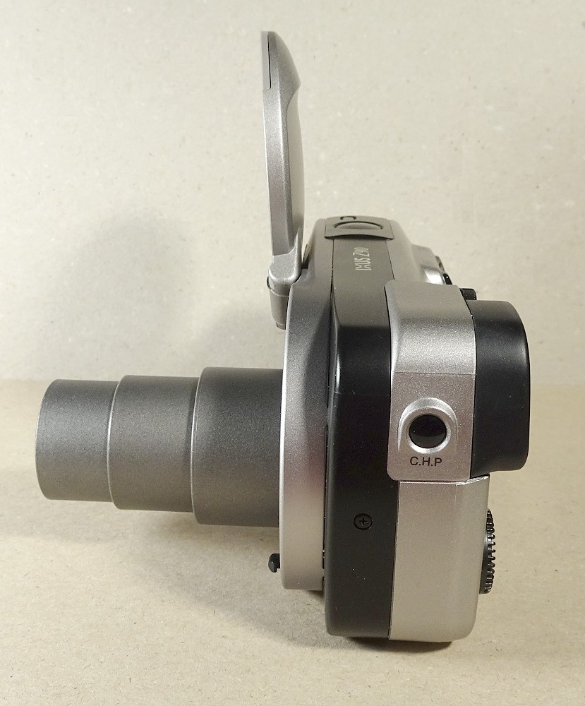 Na egal, leider habe ich keine Aufnahmen mit der Kamera machen können. Das automatische Ausschwenken der Frontabdeckung, die danach zum weit abgesetzten Blitzgerät wird, das deutlich sichtbar vorlaufende Zoom, die superhelle Zeitauslöser-LED, der Quasi-Spiegelreflex-Sucher, das hat schon was. Eigentlich schade, dass die Kamera erst am Ende der analogen Zeit auf den Markt kam.