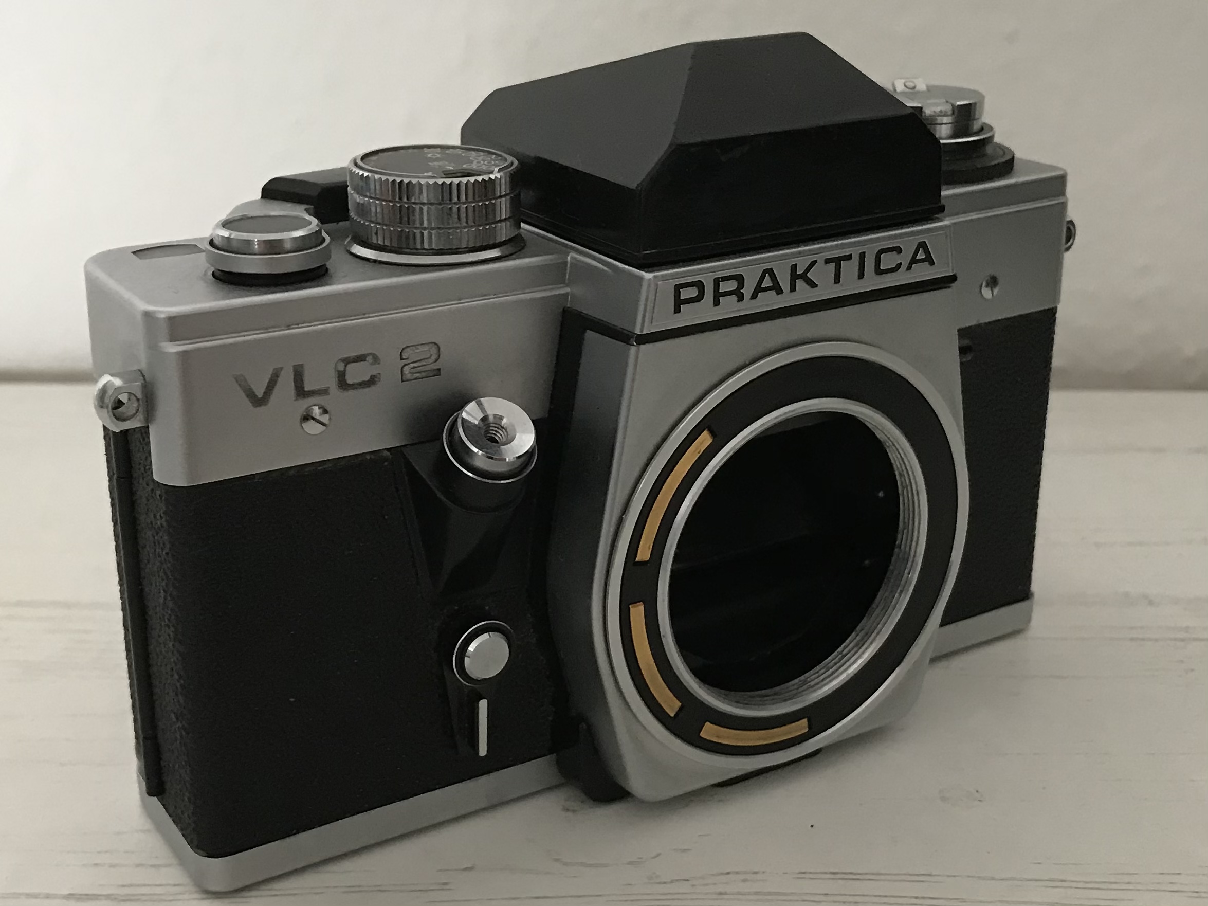 Hersteller: Kombinat VEB Pentacon Dresden Typ: Praktica VLC 2 Baujahr: 1976 - 1978 Verschluss: mechanischer horizontaler Metalllamellenschlitzverschluss (B, 1s - 1/1000s) Objektivanschluss: M42 Belichtungsmessung: TTL-Innenmessung bei Arbeitsblende und Offenblende mittels Blendwertübertragung vom Objektiv Blitzanschluss: Blitzbuchse an Kameraseite Besonderheiten: Stativgewinde, Wechselsuchersystem, Vorlaufwerk