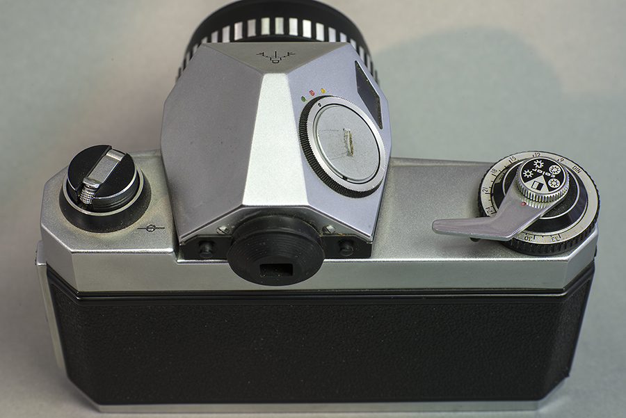 Das Verschlußrollo der Pentacon super steht so we im Bild in "Arbeitsstellung" (Verschluß gespannt), in "Ruhestellung", d.h bei entspanntem Verschluss ist das Tuchrollo oben und die Stahllamelle unten. Zum Prisma - z.Z. ist keine Batterie drin. Das war so eine kleine runde Knopfzelle, die in DDR-Zeiten Standard war und auch im Belichtungsmesser "Weimar" oder im Kleinstradio "Cosmos" zu finden war. Ich glaube, heute wäre es eine LR 44. Muß ich nochmal erkunden. Ebenso zu den Meßmethoden - ich habe mir da ehrlich gesagt vor 30 Jahren kaum einen Kopf drum gemacht weil ich ja von meinen übrigen Praktikas auch nur eine "mittenbetonte Integralmessung" gewöhnt war. Für defizile Beleuchtungsfälle nahm man sowie den Handbelichtungsmesser im Lichtmessungs-Modus (Meßrichtung vom Motiv herzur Kamera). Der S/W-Film hatte ja eh einen relativ großen Belichtungsspielraum und da ich selbst entwickelt und vergrößert habe, hatte ich in "Postproduktion" noch genügend Möglichkeiten, Fehlbelichtungen auszugleichen. Ich werde mich aber mal kundig machen. Von den drei Stellungen des Drehschalters rechts seitlich am Prisma (rot,grün,gelb) her könnte man auf drei verschiedene Meßmethoden schließen. Ich bin aber eher der Meinung das rot und grün den Ein- oder Ausschaltzustand des Prismas kennzeichnete . Ich kann mich entsinnen, das ich immer mit dem "grünen Punkt" gearbeitet habe. Bleibt noch der gelbe Punkt - ich werde mal forschen, wenn ich eine passende Batterie bekomme.