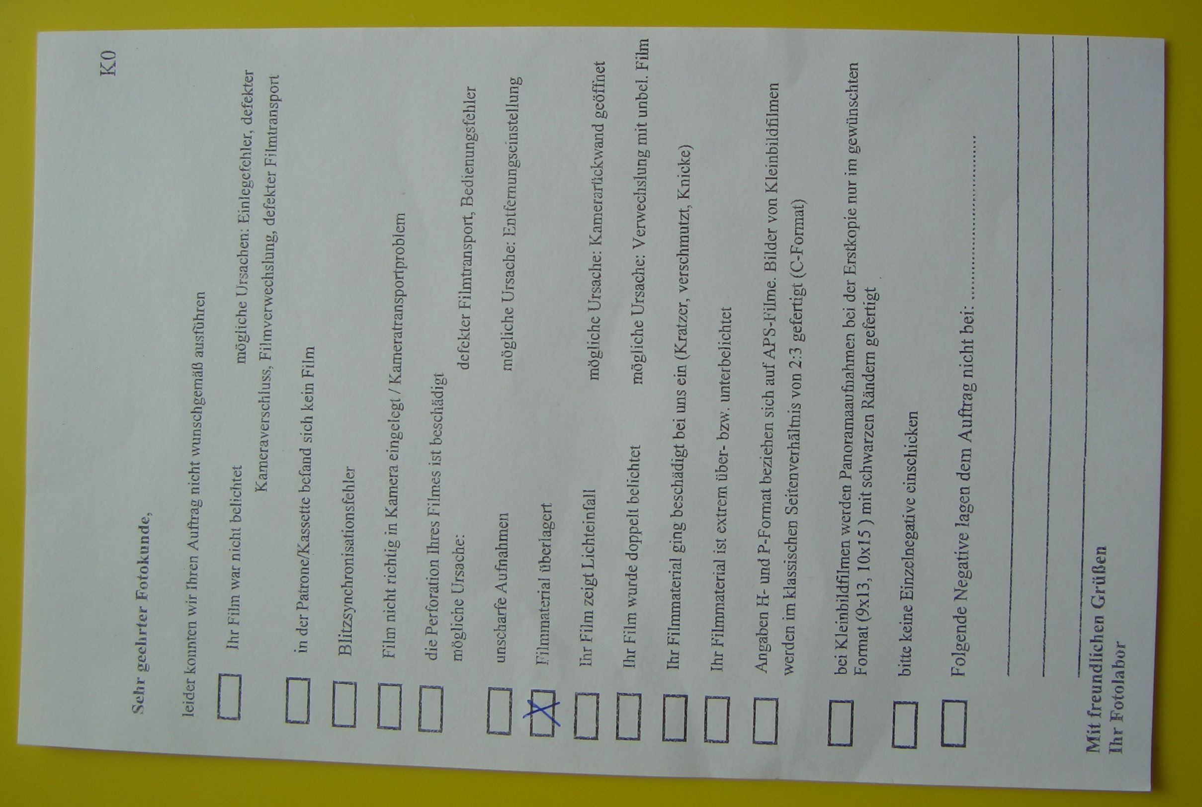 Hallo ! Also ich habe heute den Film abgeholt und es ist nichts geworden.Der Film war schön in einer Hülle eingeschoben und komplett durchsichtig... Innen lag noch eine Zettel mit einem Kreuz bei : "Film überlagert". Naja hat alles in allem nur 2,55€ gekostet.