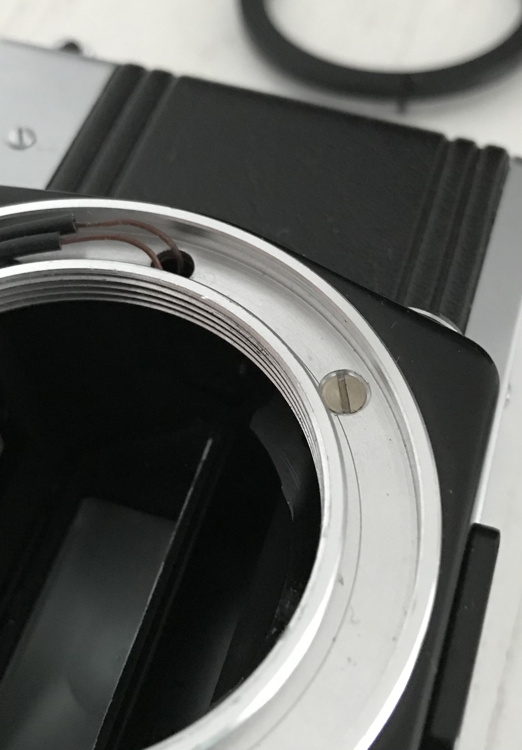 Möglicherweise war es eine verchromte Version bei der das entsprechende Teil beschädigt war und dann durch ein schwarzes Bauteil (das evtl. noch irgendwo auf Lager war) ersetzt wurde. Dagegen spricht jedoch dass die Kamera keinerlei anderen ersichtlichen Spuren einer möglichen Beschädigung besitzt und auch die Verschraubung des Objektivanschlussringes keine Werkzeugspuren aufweist. Es schaut vielmehr so aus als wäre die schwarze Spiegelkastenverkleidung ab Werk so gewollt. Vielleicht hat ja von euch jemand eine Idee oder kann Hinweise dazu geben!?