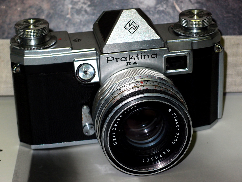 Das auffälligste Merkmal der Praktinas ist, daß sie einen separaten Sucher haben. Sie war eine der ersten Systemspiegelreflexkameras und wurde von den Kamera-Werkstätten Niedersedlitz produziert. Vorgestellt wurde sie auf der Fotokina in Köln 1952. Es gab sehr viel Zubehör z.B. Wechselsucher, austauschbare Einstellscheiben, Wechselobjektive, Federmotor oder Elektromotor, Stereovorsatz für den entsprechenden Stereosucher usw.. Hier wird die Nachfolgekamera der FX die Praktina IIa gezeigt. Die Blendenauslösung der ASB-Objektive (IIa) (automatische Springblende) ist eine andere als die der SB Objektive der FX, die Objektive zur IIA erkennt man zumeist an der "Blederung" am Meterring. Arbeitsblende ist mit den SB Objektiven (Springblende) jedoch möglich. Es gab auch im Westen umgebaute Praktina IIa, an denen man die SB Objektive um 120 Grad gedreht ansetzen konnte. In der DDR wurde die IIa nicht verkauft.