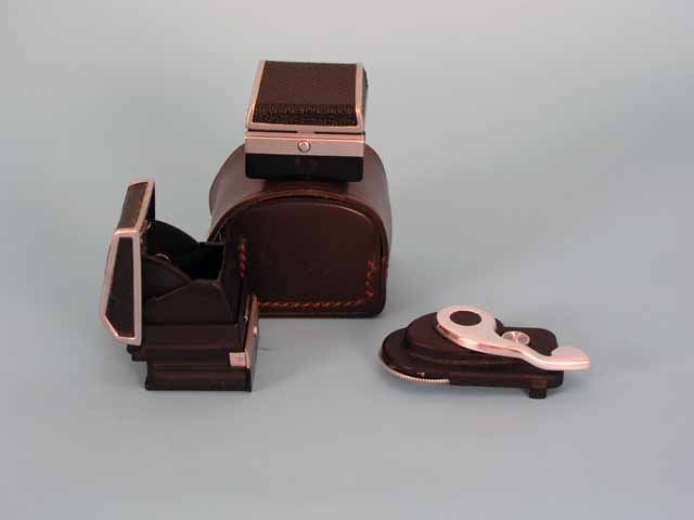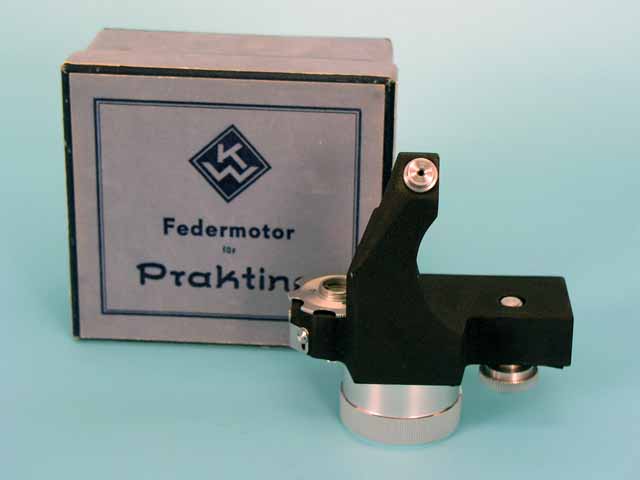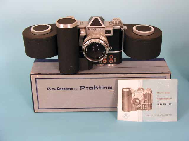Ich hänge noch ein paar Bilder mit dem o.g. Zubehör an. Das Prisma mit Belichtungsmesser ist auf einer Praktina FX und das kleine Teil neben dem Lichtschacht ist ein Schnellspannhebel, den man an der Unterseite der Kamera anschrauben kann. Mit der 17m-Kassette konnte man mal eben 400 Bilder machen. Zu dem Elektromotor gehört noch ein Bleiakku (den habe ich nicht im Bestand) und ein Fernauslöser. Dafür sind die 4 Buchsen an der Vorderseite