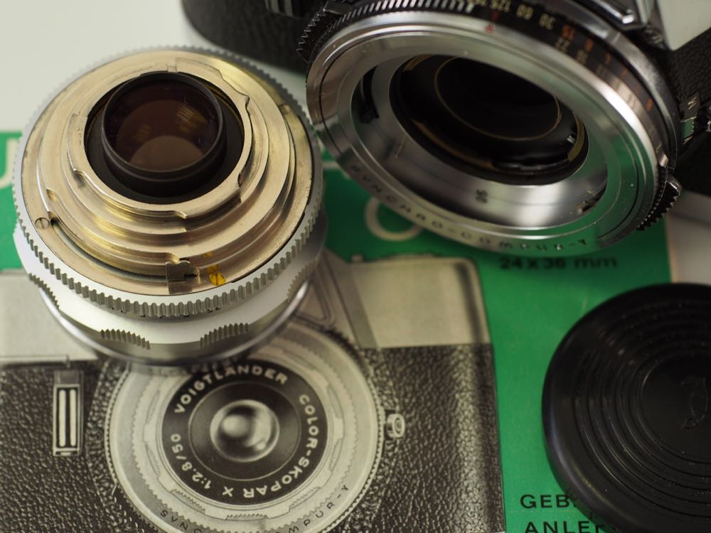 Objektiv: Voigtländer Color-Skopar 2,8/50mm oder Voigtländer Septon 2,0/50mm (Siebenlinser, auf Grund des kleinen Durchmessers des Zentralverschlusses von 22,5mm mußte vermutlich bei der sechslinsigen Grundkonstruktion eine siebte Linse eingeführt werden um die maximal mögliche Blendenöffnung von 2,0 zu erreichen)